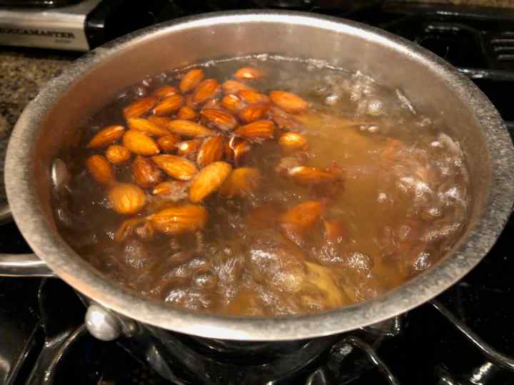2. Drop the almonds into a small saucepan of boiling water. Two minutes after the water returns to a boil, drain through a sieve. Wrap the almonds in a dampened dish towel. Rub the almonds briskly in the towel, unwrap the towel, and remove those almonds with loosened peels. Remove the peels. Wrap up the remaining almonds and repeat the rubbing procedure until all the almonds are peeled. Put the almonds in a food processor fitted with the steel blade and chop until pulverized. (I found that after drying, it was easier to peel the almonds by pressing the thick end between my thumb and index finger.)