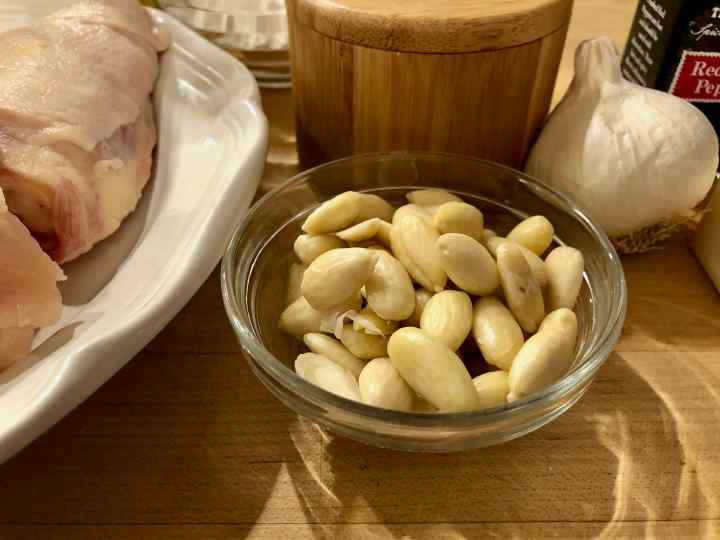 So when I came home from the event, as a personal tribute, I decided to cook one of Marcella’s recipes that I’ve wanted to make for some time: “Fricasseed Chicken with Almonds.” It’s from one of her later books, Marcella Says. . .. Like so many of her recipes, it uses a minimum of ingredients, yet delivers an abundance of flavor.