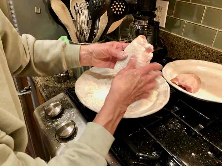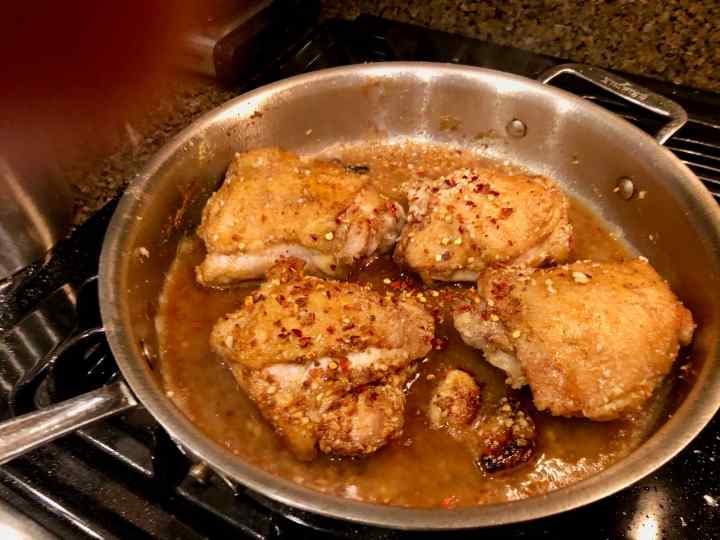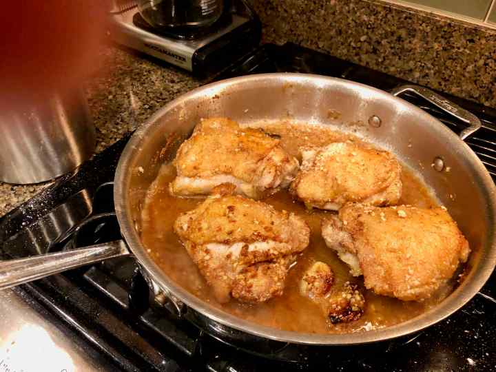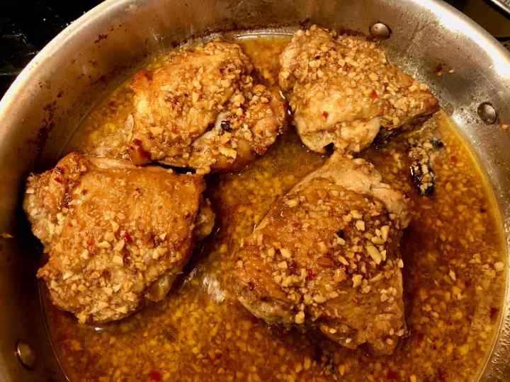 1. Wash the chicken pieces under cold running water, then set in a footed colander to drain. (Following more contemporary guidelines, I skipped the washing, but dried the chicken thighs well with paper towels.)
