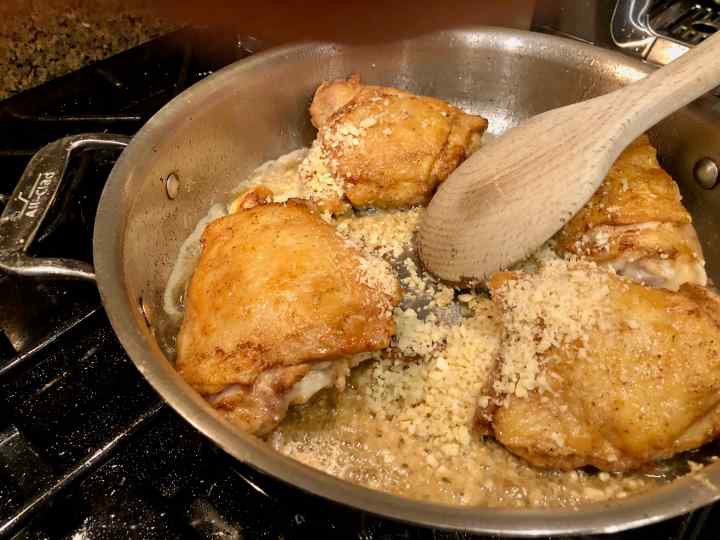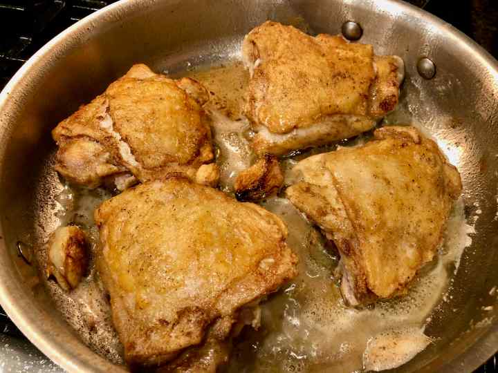 Ahead-of-time note: If you are serving the chicken for dinner, you can cook it through to the end that morning. Refrigerate and reheat gently in the same pan.