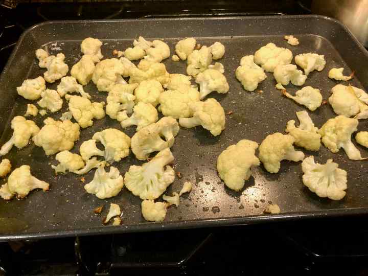 6. Sprinkle the Parmigiano on top and roast for another 15 to 30 minutes, or until cauliflower is tender and the cheese is lightly browned.