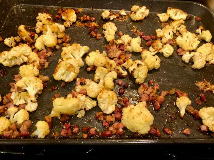 5. Remove the cauliflower from the oven, add the pancetta and cumin seeds to pan, and gently toss.