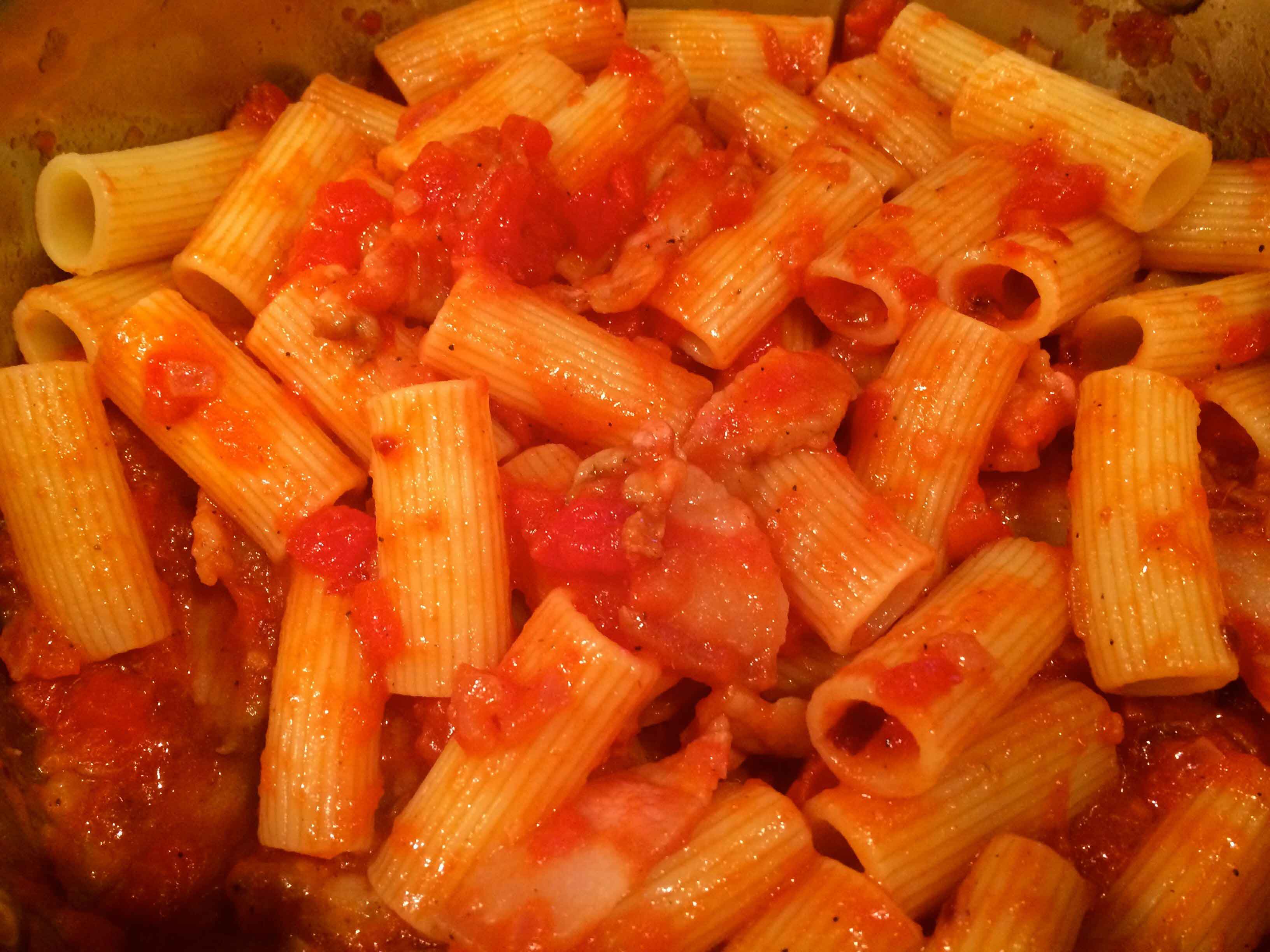 I couldn’t get to the grocery store yesterday, and we both wanted pasta. Therefore, I had to rely on what was on hand: half a red onion, canned plum tomatoes, olive oil, crushed red-pepper flakes, a half pound of rigatoni.