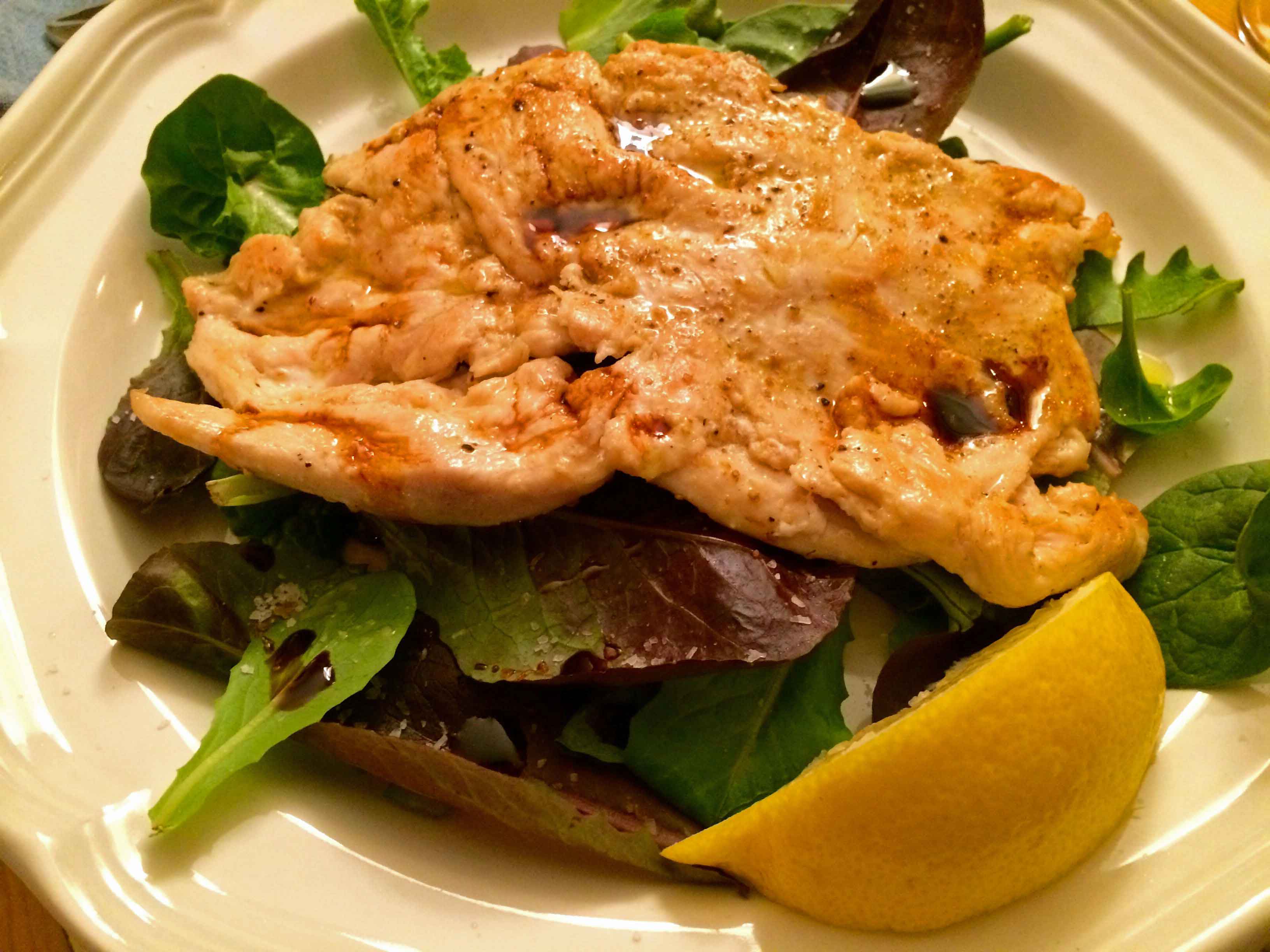 5. Drizzle the breasts with some extra virgin olive oil and just a few drops of a thick balsamic vinegar and serve with a lemon wedge to be squeezed on the chicken and the salad.