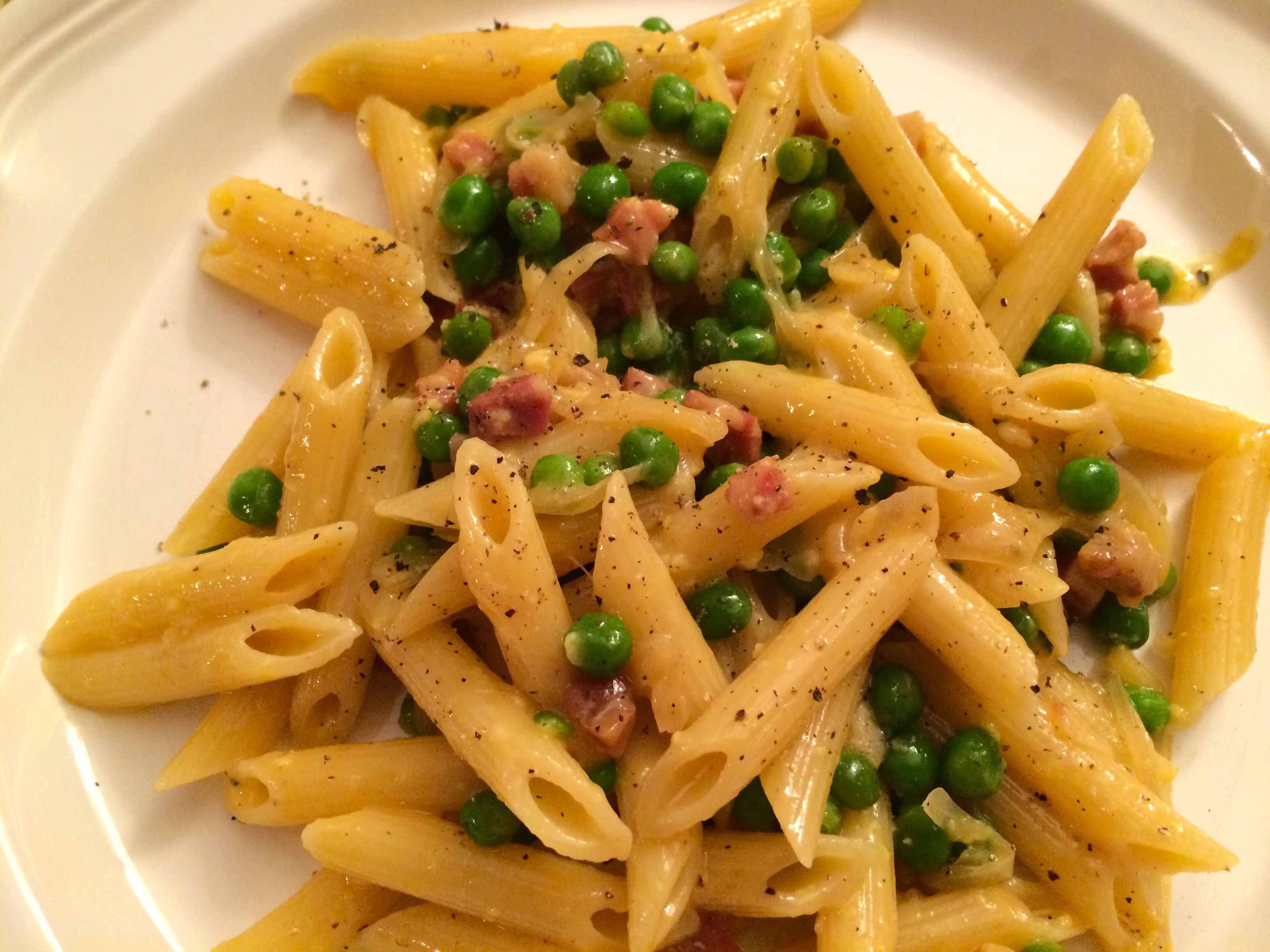 As I began to think of peas, however, my mind turned to a childhood dish of those little green gems simmered with sautéed onions and pancetta. But then, the thought of savory pancetta brought to mind pasta alla carbonara. By the time I got home, I decided to attempt a fusion of the two dishes for supper.