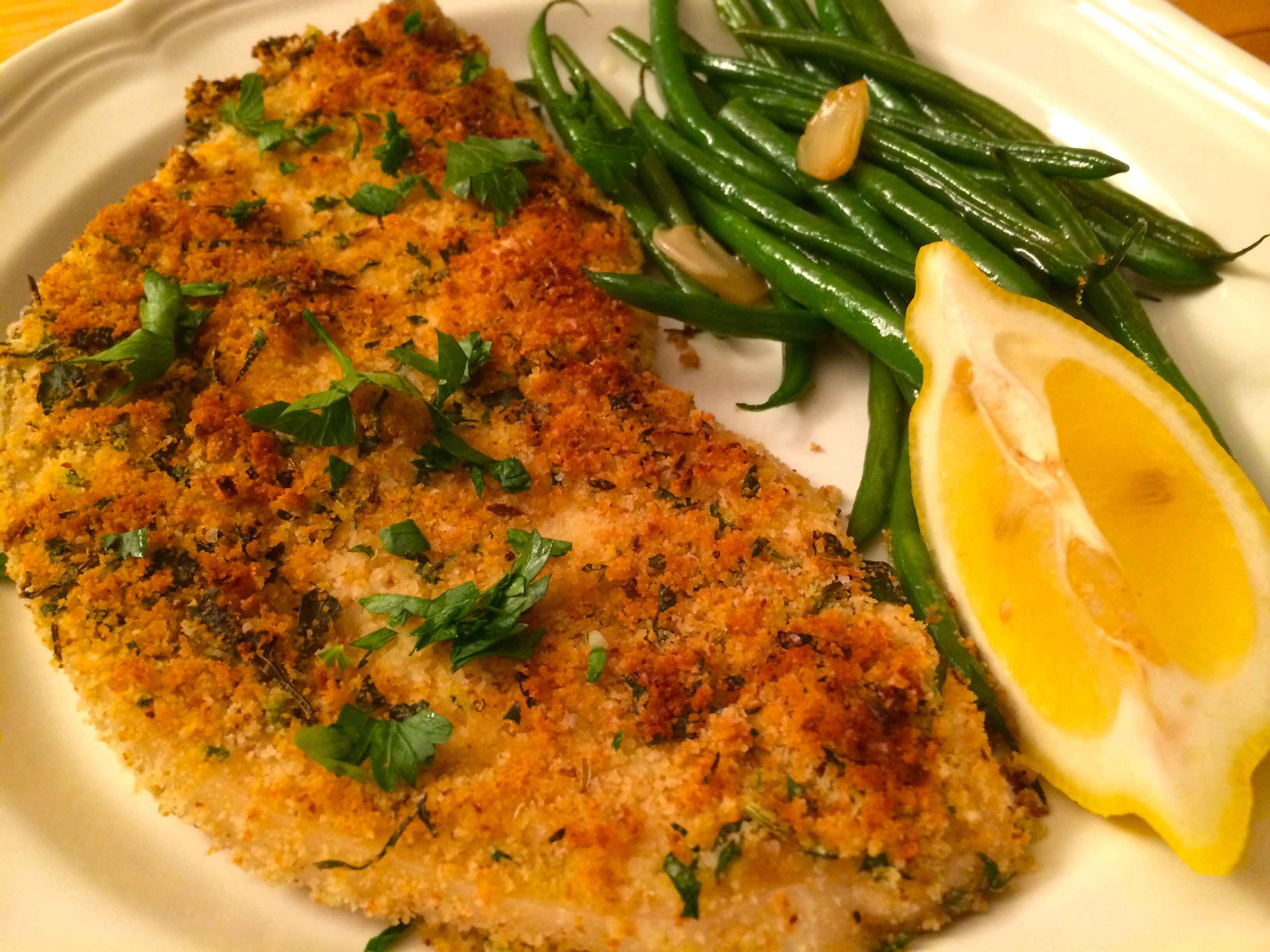 For me, one of the most attractive characteristics of Italian cooking has always been its simplicity–its recipes with minimal ingredients and simple preparation. As I child, I used to watch my mother and aunt in the kitchen turn out multi-course dinners for us, night after night, without breaking a sweat. They cooked from memory the simple dishes with which they themselves grew up. One such dish was baked fish coated with breadcrumbs, which hailed from my mother’s Sicilian family.