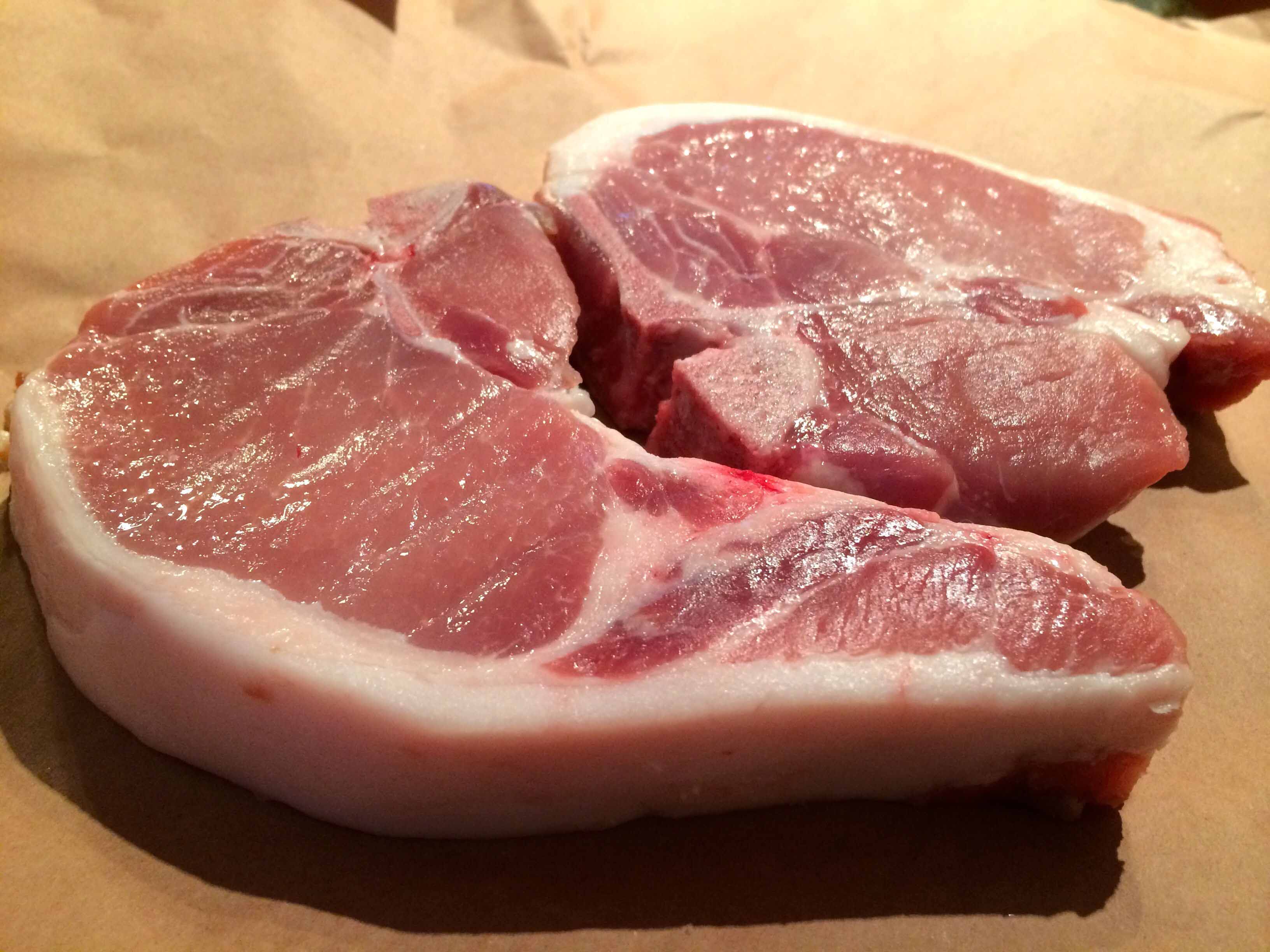 Often my choice of what we’ll have for dinner is determined by what’s in the market. Such was the case yesterday, when I went to our butcher and found some pretty good looking heritage pork chops sourced from local farms.