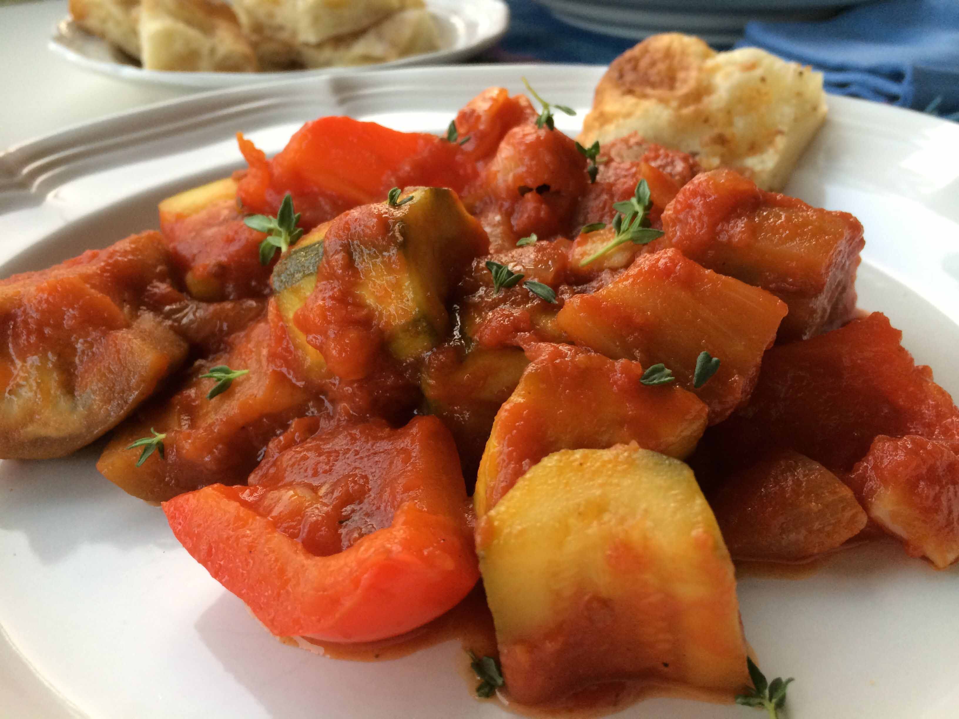 Add tomatoes, eggplant, zucchini, bay leaf, fresh thyme to the pot. Cook, stirring occasionally, until mixture come to a simmer. Reduce heat to medium low, partially cover, and cook at a gentle simmer until vegetables are cooked through, around 30 minutes. If sauce becomes too thick or starts to stick while cooking add a couple of tablespoons of water from time to time.
