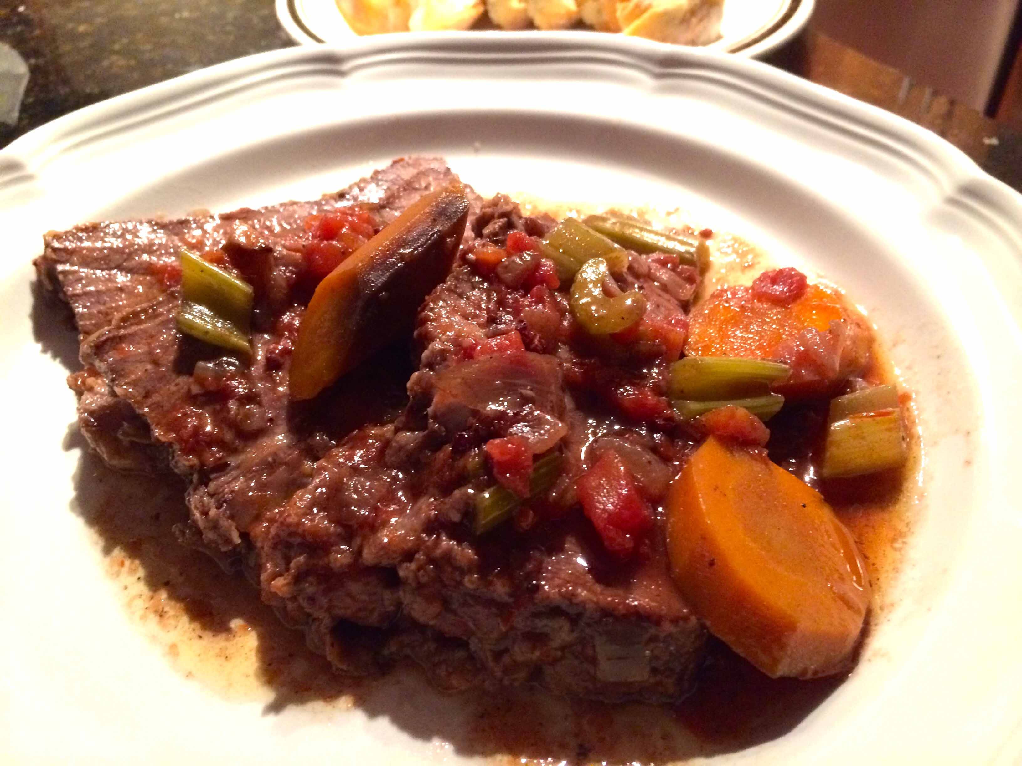 Here’s a link to the recipe online. If you like your carrots and celery in the braise to have some chew, you may opt, as I did, to slice them on the thick side. However, any way you choose to slice your vegetables, this recipe yields an aromatic and deliciously succulent roast that holds its shape even after six hours of cooking.