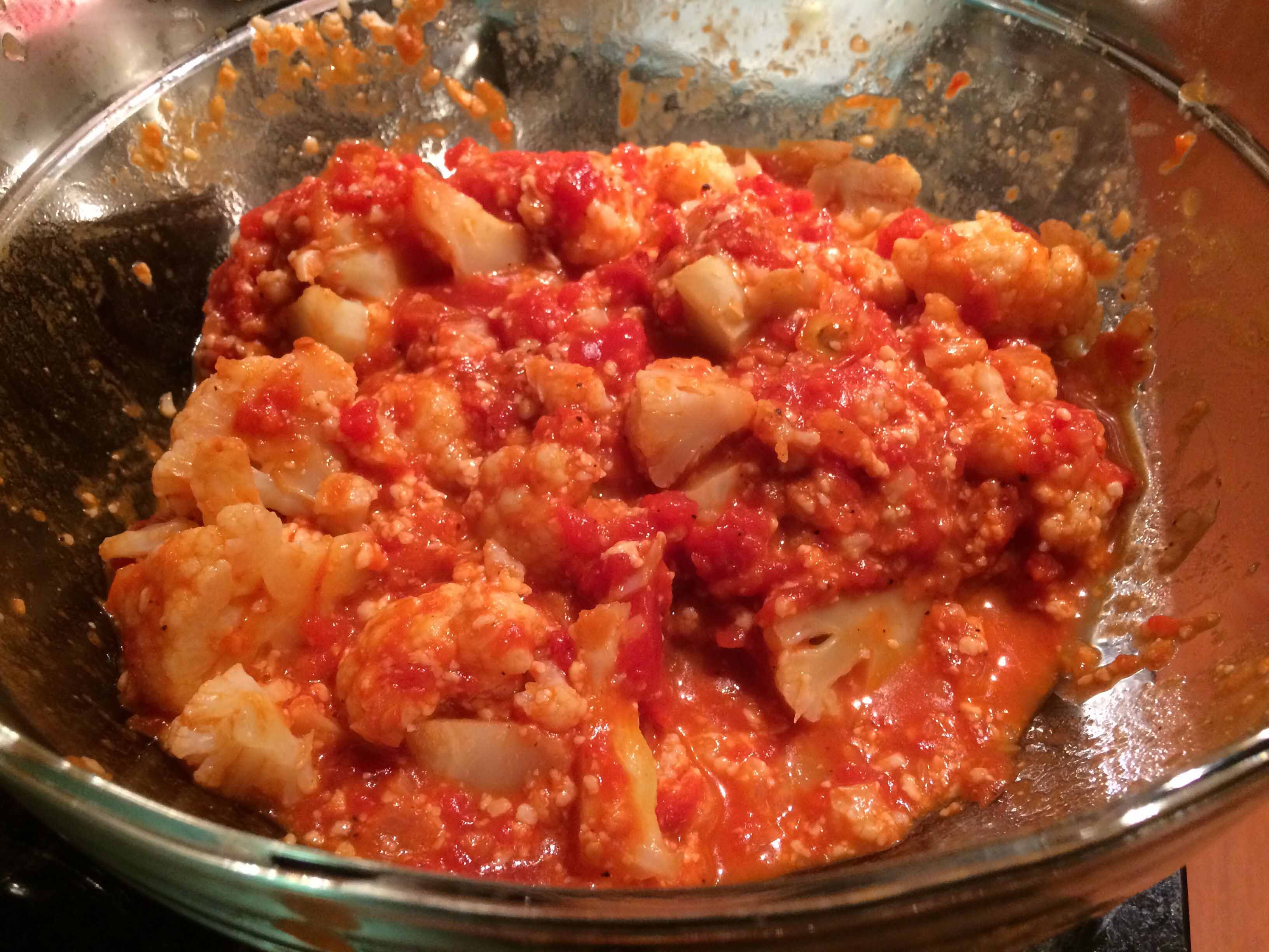 Transfer the tomatoes to a large bowl and stir in the Parmigiano-Reggiano. Gently fold in the cut cauliflower and taste again for seasoning. The cauliflower should be well coated with the sauce.