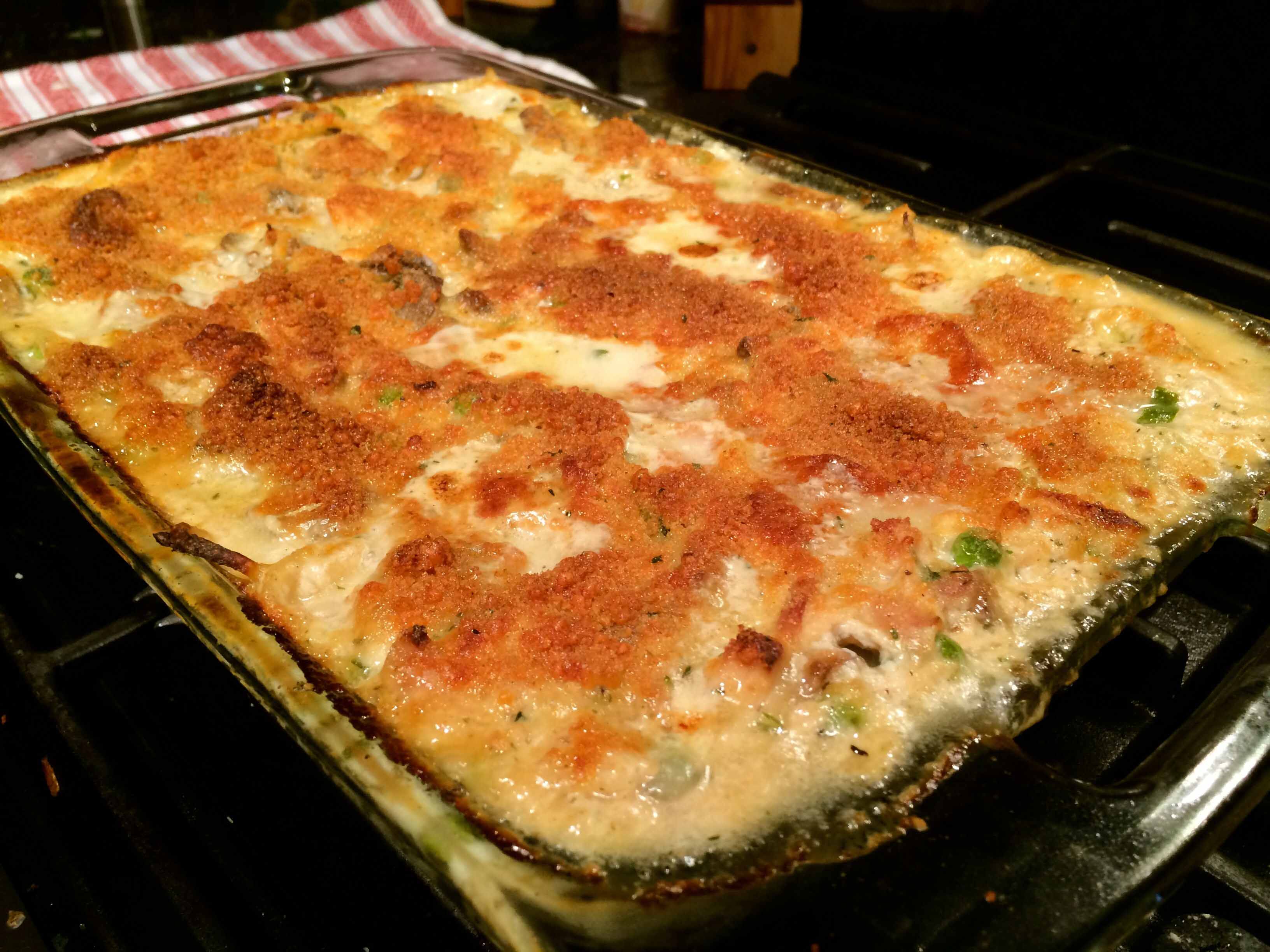 9 tablespoons butter 2 tablespoons olive oil 4 boneless skinless chicken breasts (I substituted the meat from a half of a rotisserie chicken.) 2 1/4 teaspoons salt 1 1/4 teaspoons freshly ground black pepper 1 pound white mushrooms, sliced 1 large onion, finely chopped 5 cloves garlic, minced 1 tablespoon chopped fresh thyme leaves 1/2 cup dry white wine 1/3 cup all-purpose flour 4 cups whole milk, room temperature 1 cup heavy whipping cream, room temperature 1 cup chicken broth 1/8 teaspoon ground nutmeg (I used at least a 1/4 teaspoon.) 12 ounces linguine 3/4 cup frozen peas 1/4 cup chopped fresh Italian parsley leaves 1 cup grated Parmesan 1/4 cup dried Italian-style breadcrumbs