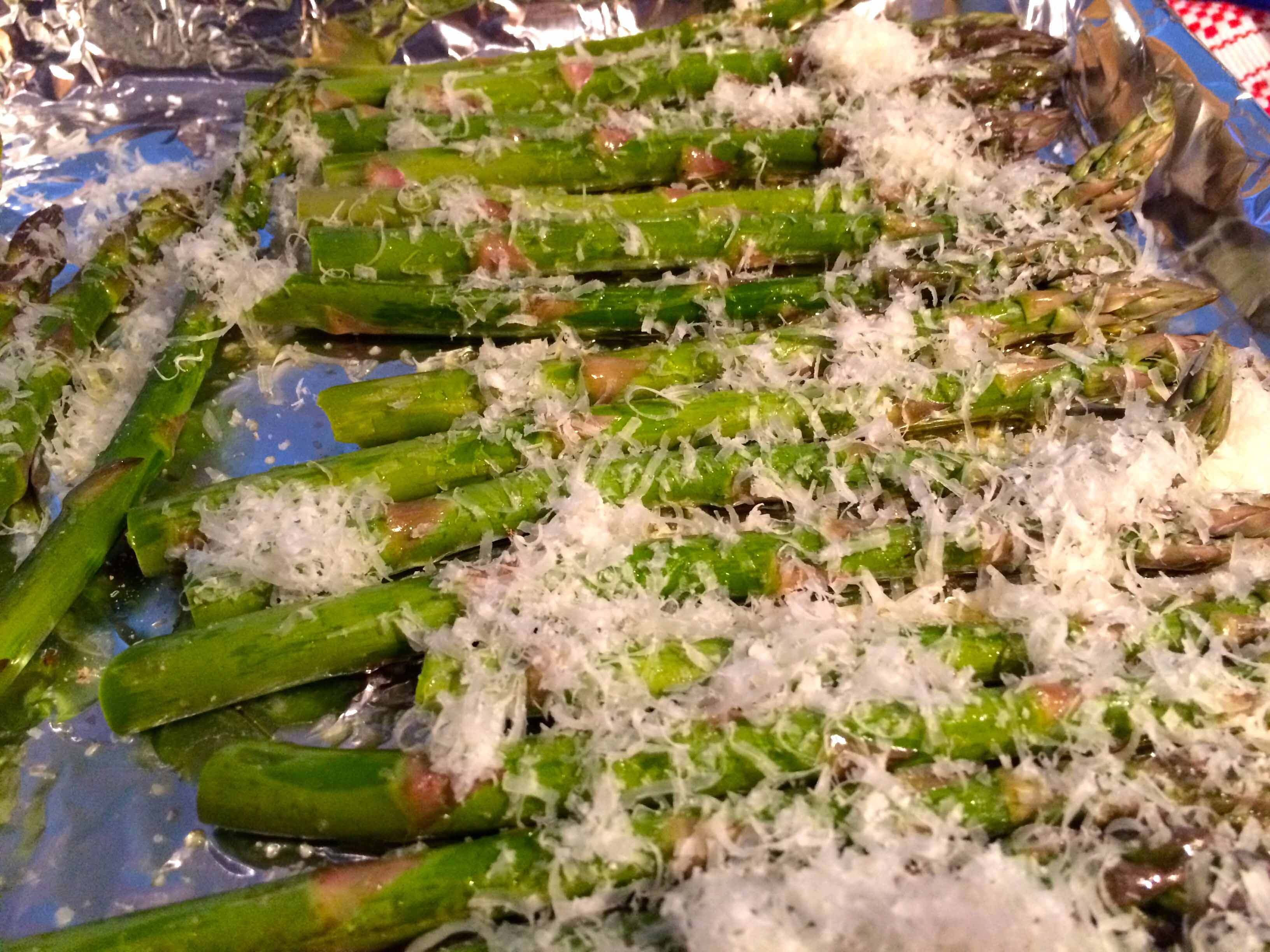Grate a generous amount of Parmigiano-Reggiano over the asparagus and roast for about 15 minutes. The thickness of the asparagus will determine the exact cooking time.