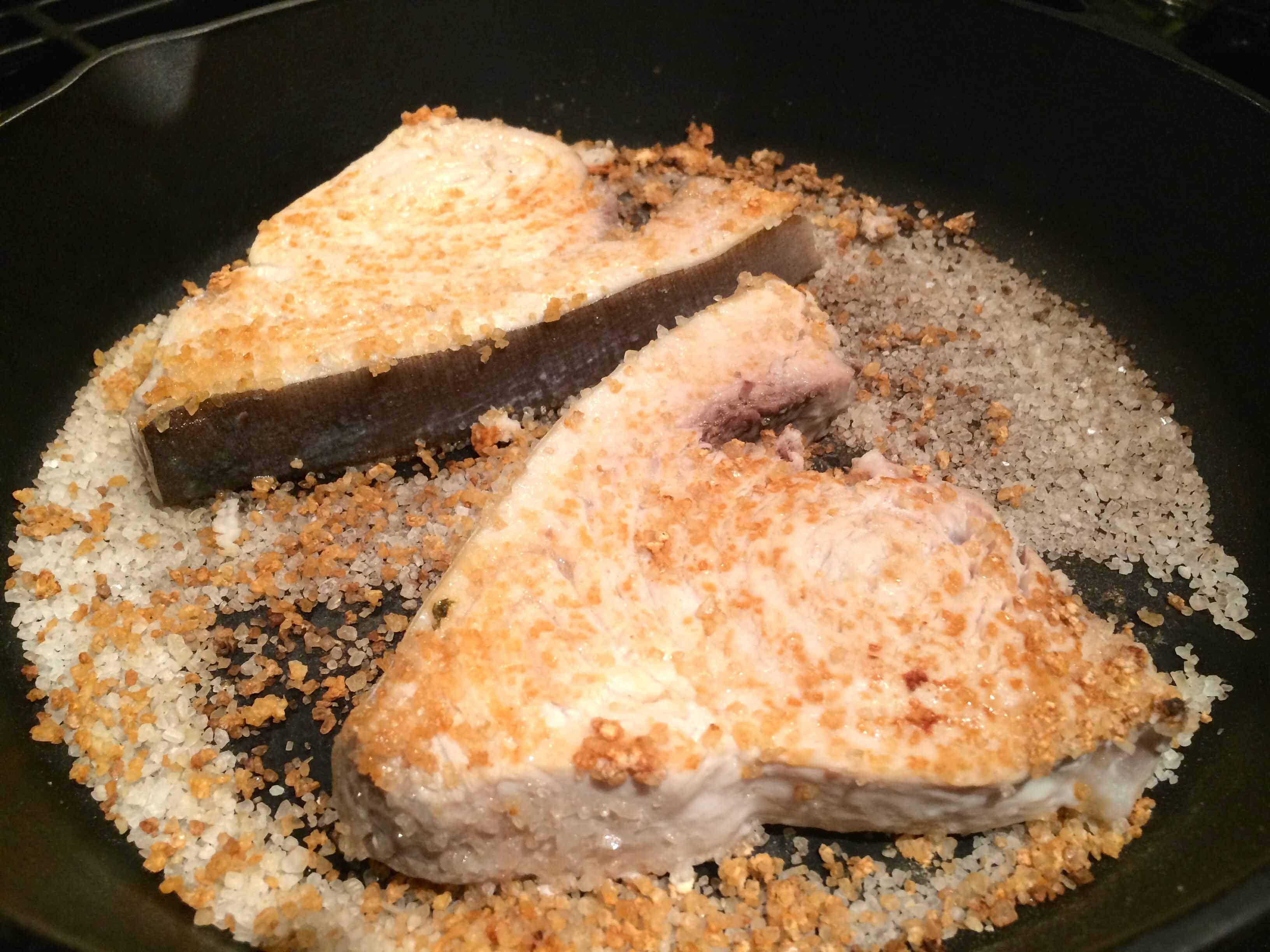 Lift the fish from the pan with tongs or a fork and brush off any large pieces of salt clinging to it. (Since we really like salt, I left a few crystals on our steaks.)
