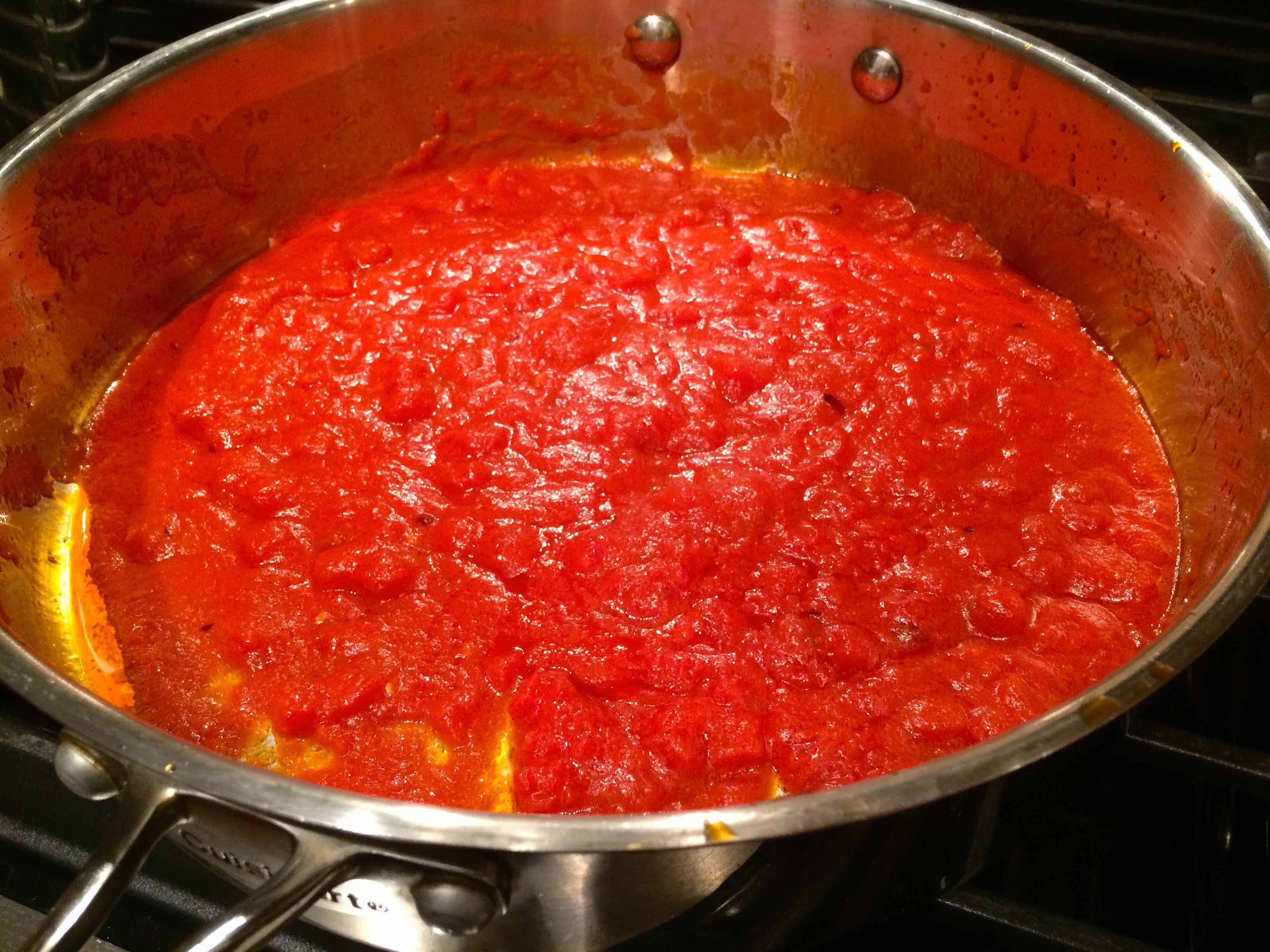Batali’s recipe calls for a tablespoon of hot-red pepper flakes, but as I use the Calabrian variety, which I believe are considerably hotter than most, I reduce this amount considerably. But let your own palate be the judge. It also calls for 1/2 cup of tomato paste, which is toasted briefly with the peperoncini in olive oil. This makes for an intense tomato flavor, especially if you use the concentrated Italian variety that comes in a tube.