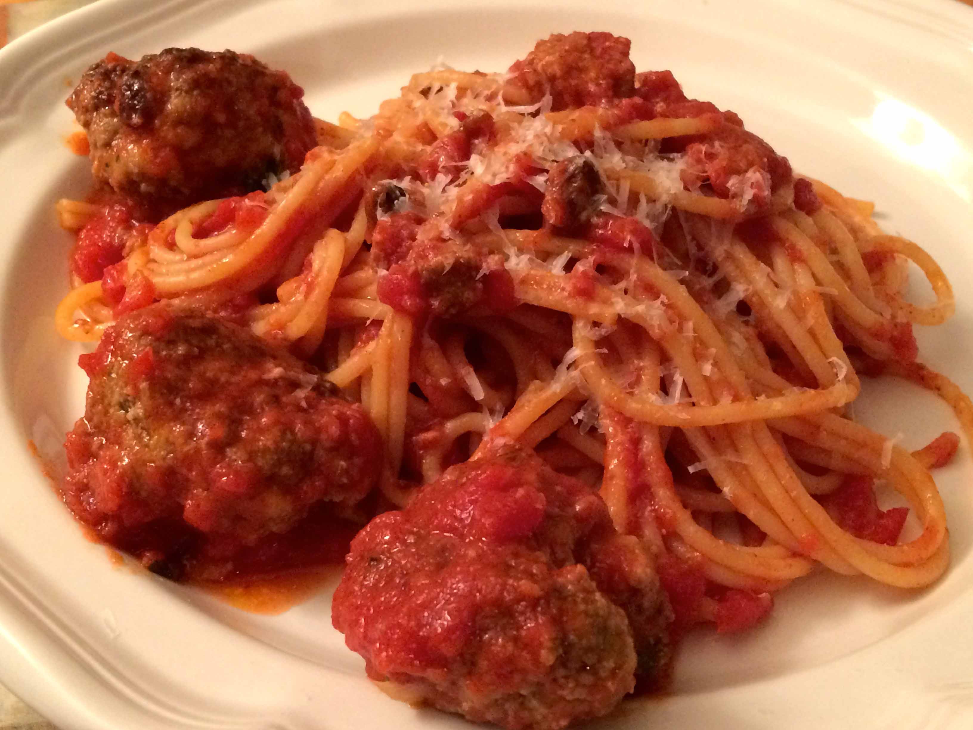 Serve with spaghetti tossed with the sauce from the meatballs and sprinkled with grated Romano.