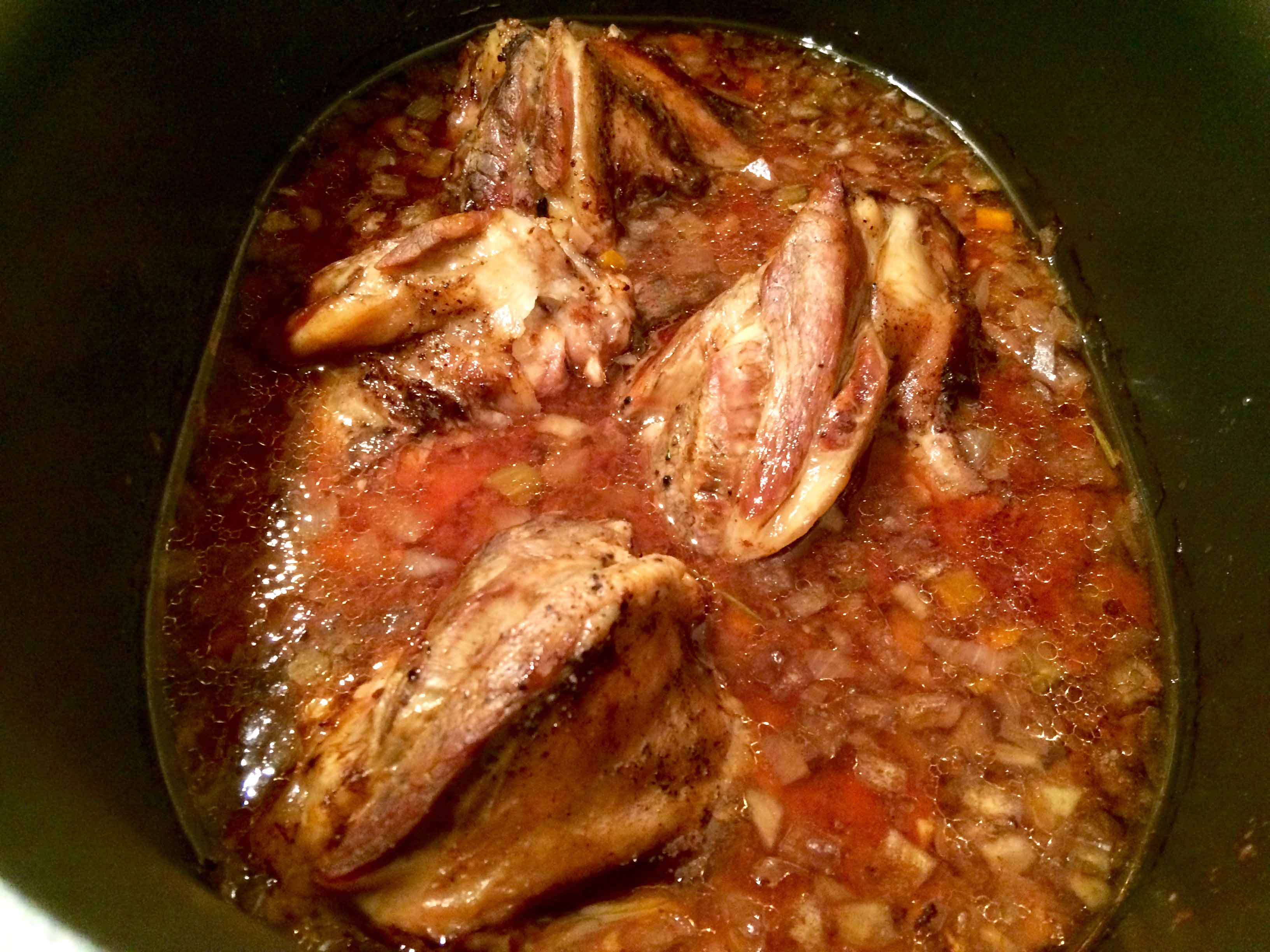 Combine the broth, wine, and tomato paste with a whisk in a bowl. Pour the mixture over the lamb and cook on low for 8 hours, or until the lamb is very tender and coming away from the bone.