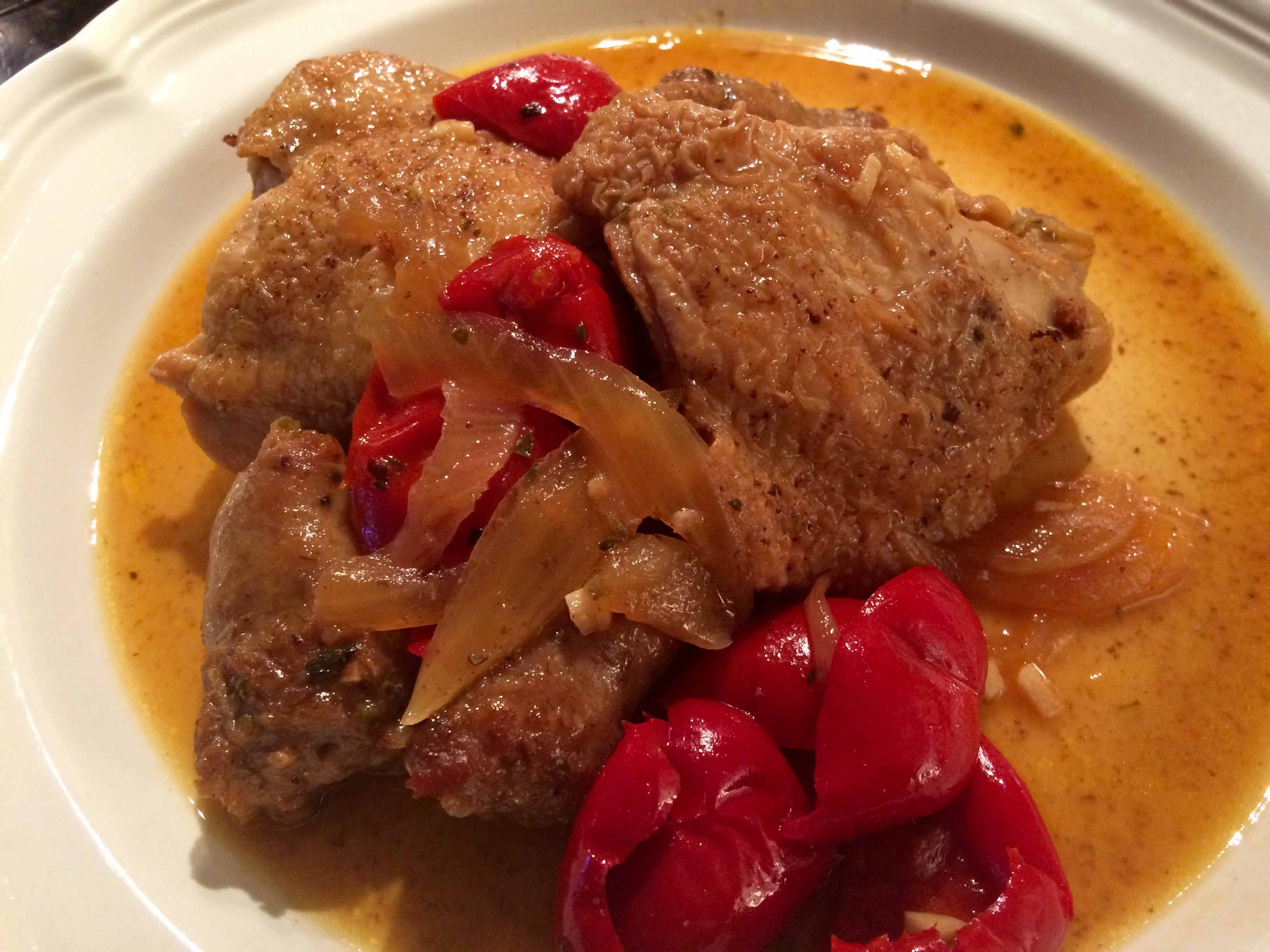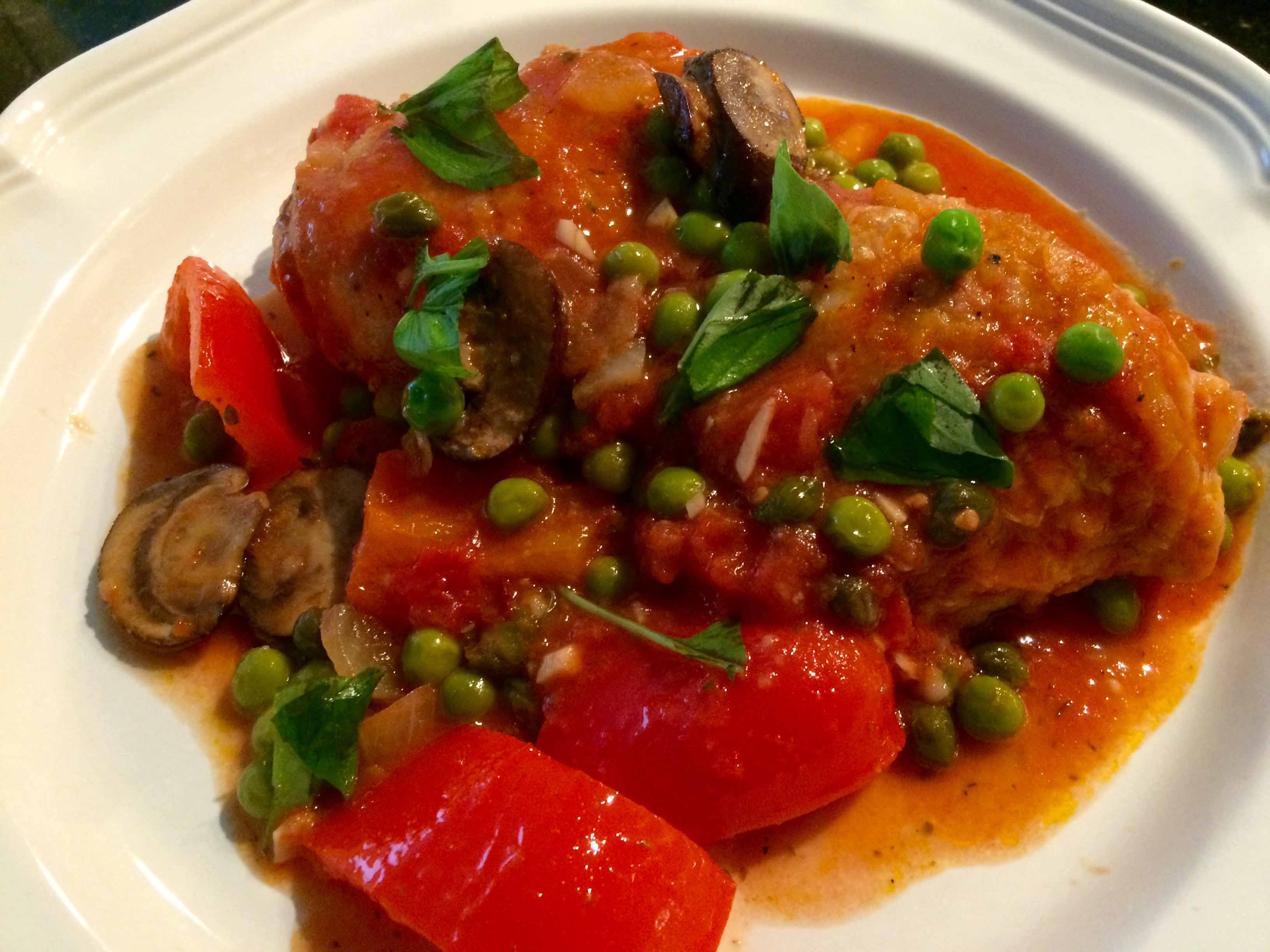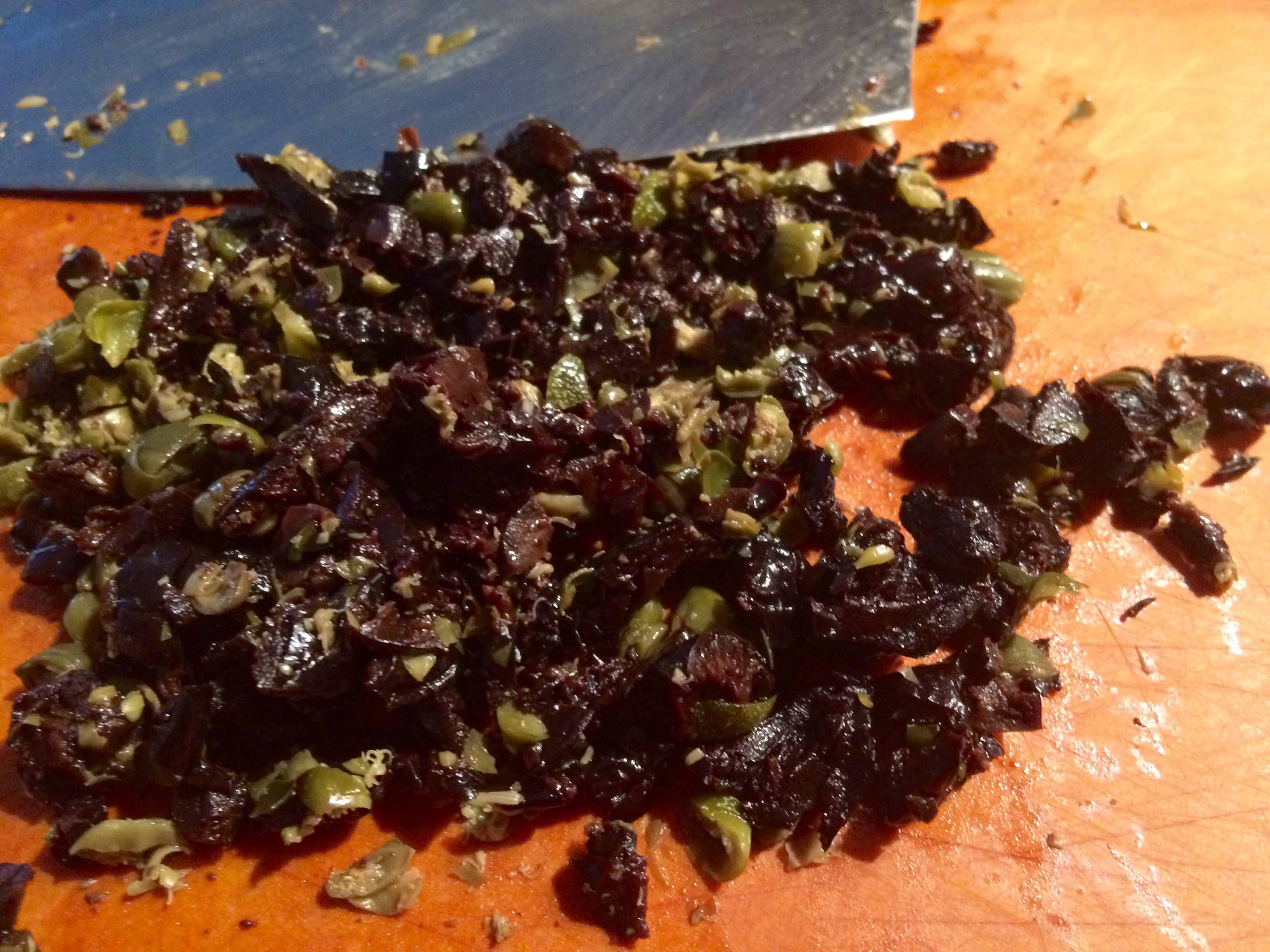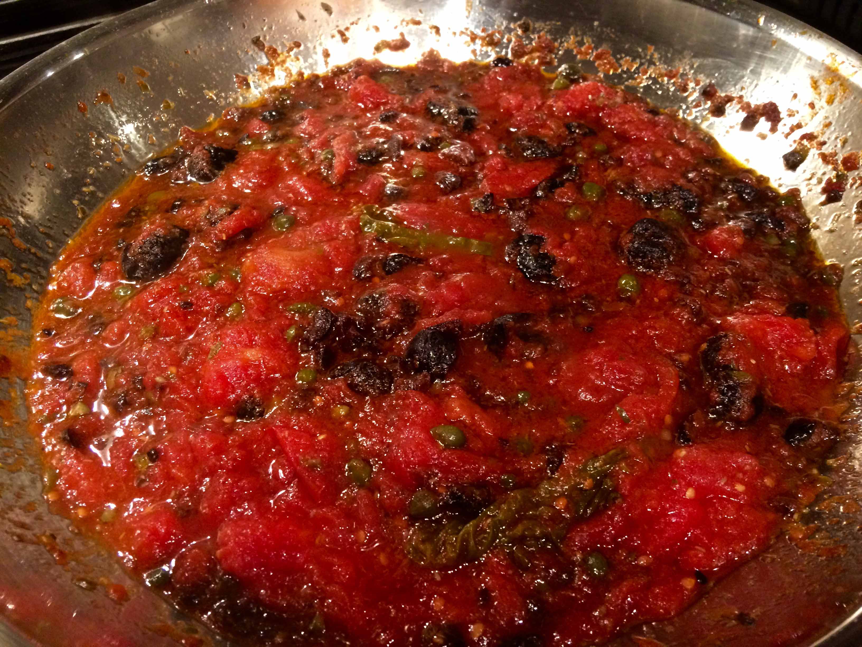 I adapted the book’s recipe to our tastes and used considerably more anchovies and capers than called for and opted for the stronger flavor of oil-cured black olives. Unable to find good tomatoes, I also substituted the canned San Marzano variety.