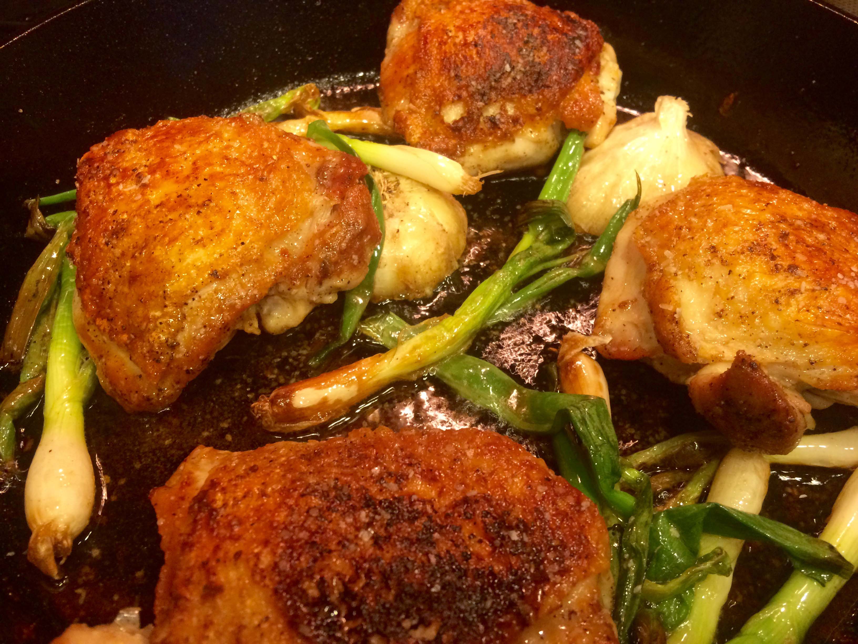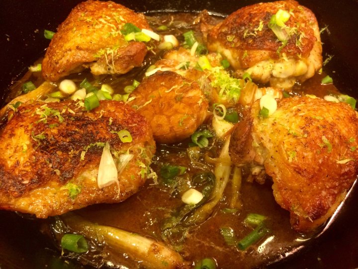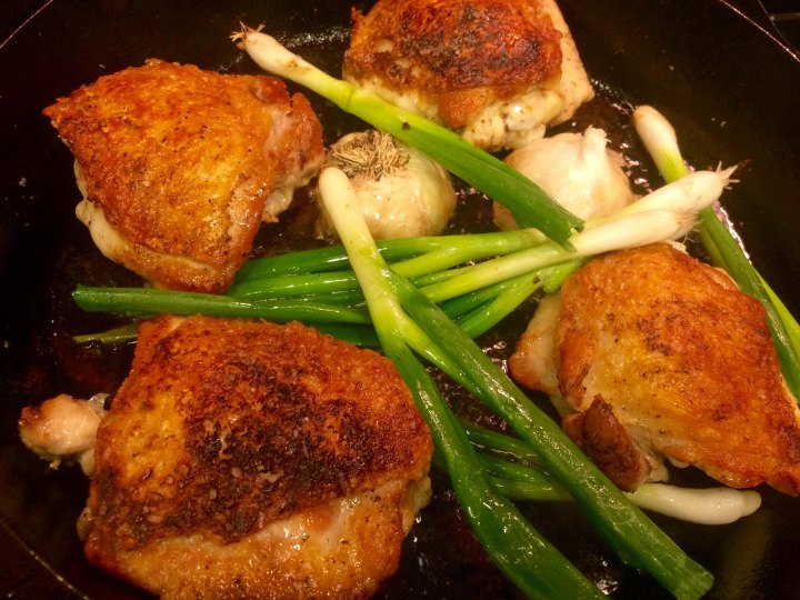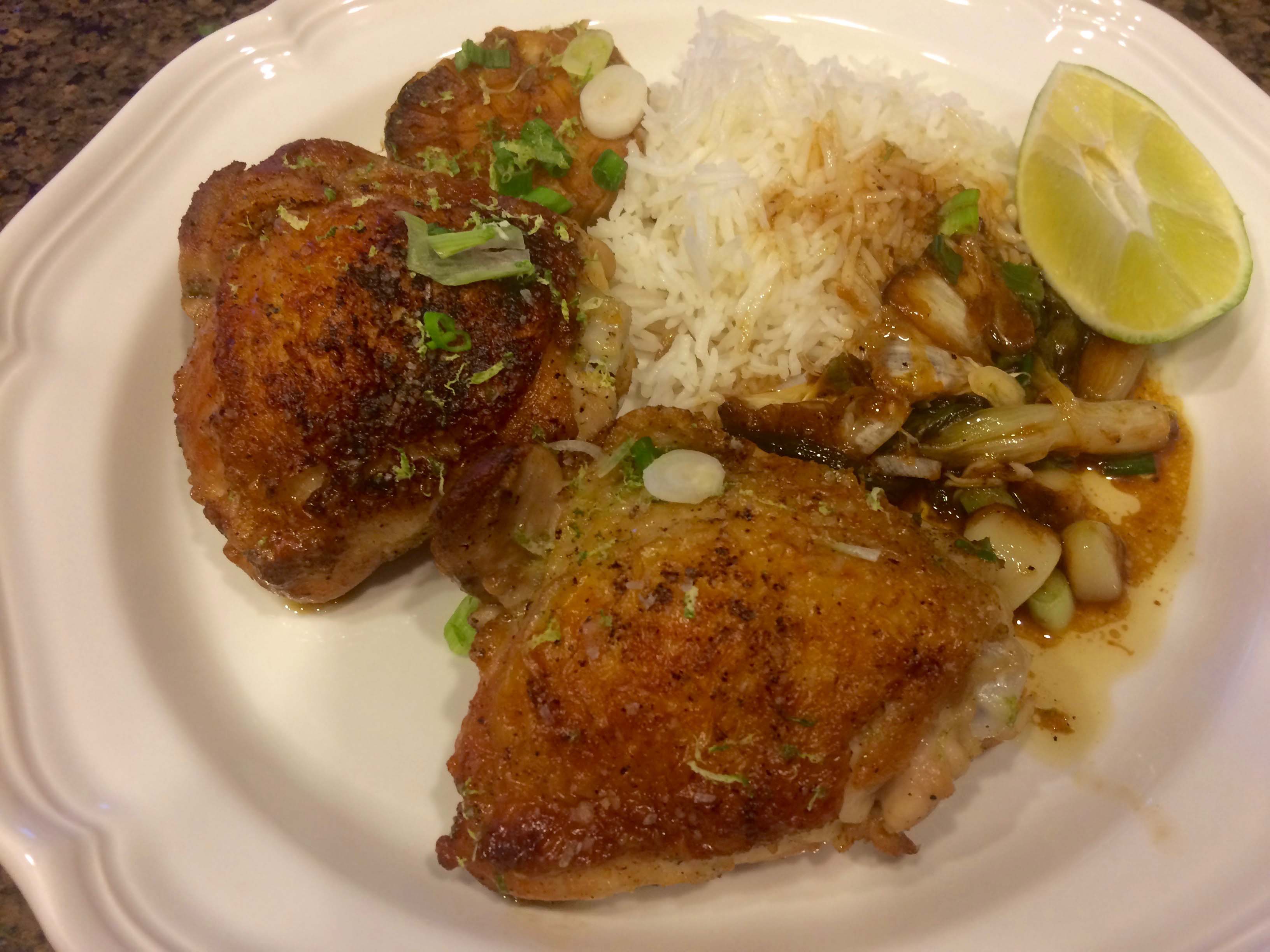 Our markets in downtown San Diego frequently seem to have extraordinary sales on chicken; for example, today I found bone-in skin-on chicken thighs for 77 cents a pound. Consequently, my plans for a pasta dinner were put on hold and replaced with a dish that caught my eye on the New York Times “Cooking” site: Garlicky Chicken Thighs with Scallion and Lime.