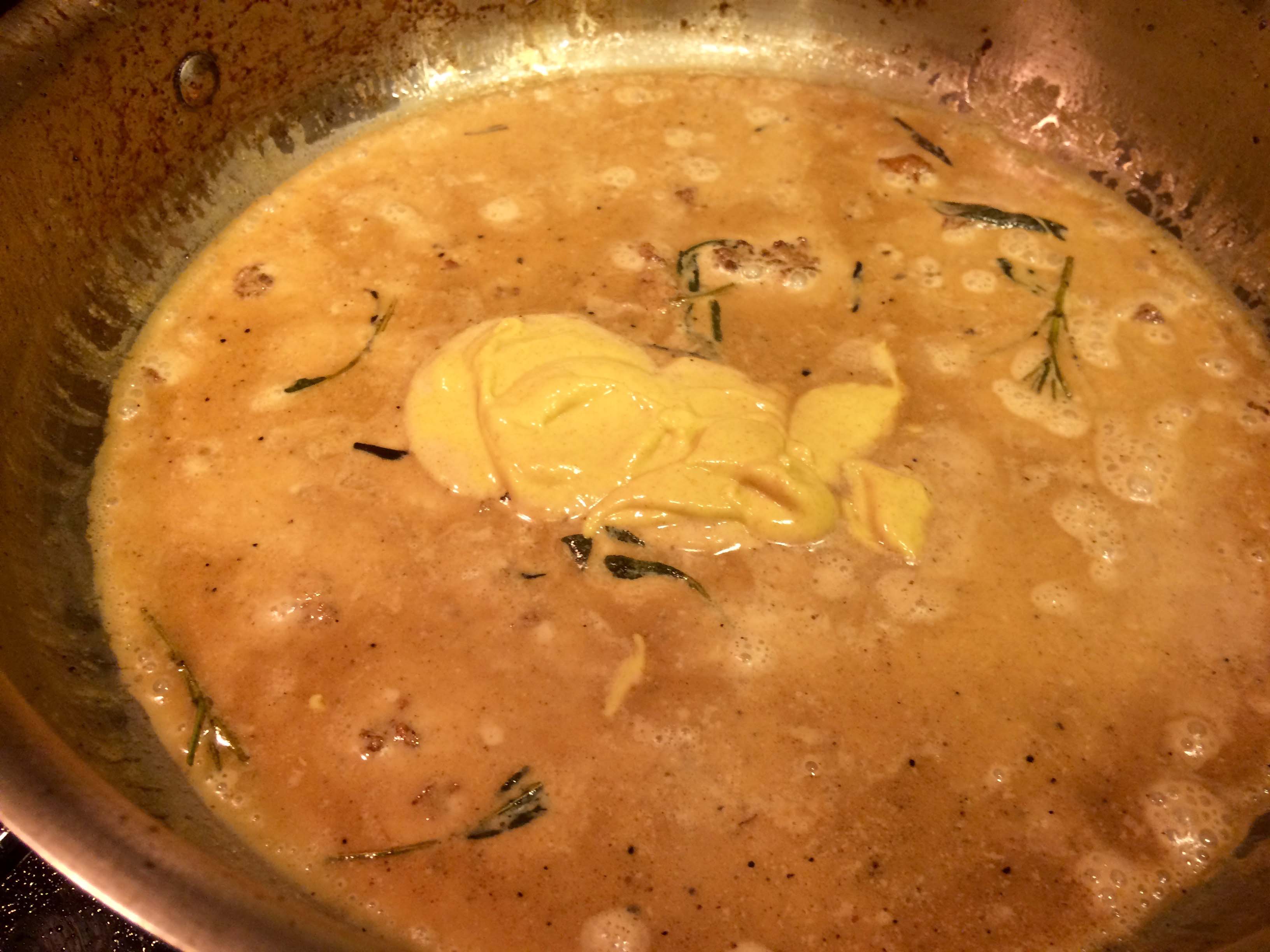2. Cut meat into inch-thick slices. Once again turn heat to medium-high, add remaining butter and/or oil and, when it’s hot, add pork slices to pan.