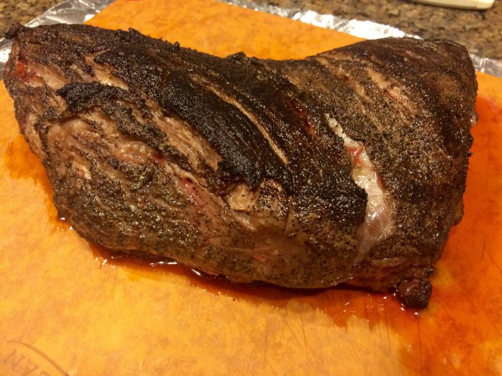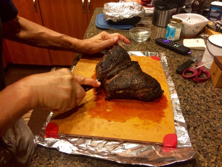 6. Rest roast on a cutting board 10 to 20 minutes. Slice against the grain. The roast is shaped like a boomerang, so either cut it in half at the center of the angle, or slice against the grain on one side, turn the roast and slice against the grain on the other side.