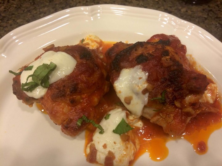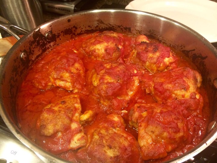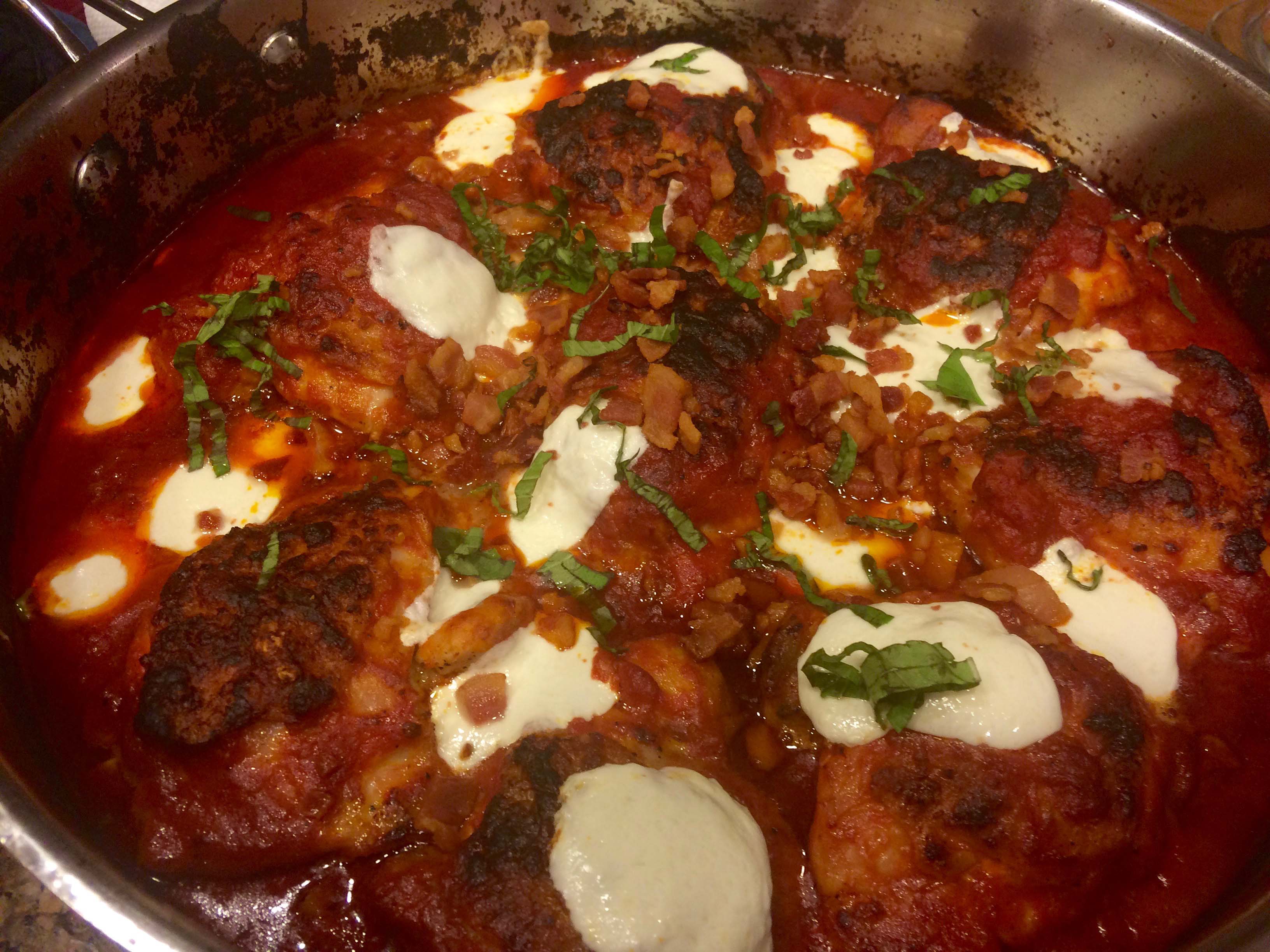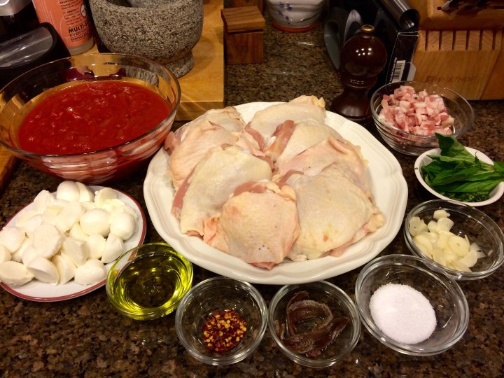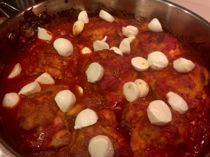 Well last night, I finally made the dish and am happy to report it was a huge success, or as my better half proclaimed “a keeper!” The sauce had layers of flavor from the anchovies and pancetta; the bocconcini, perfectly melted, complemented the sauce; and the chicken thighs were moist and juicy. A far cry from that first chicken parm.