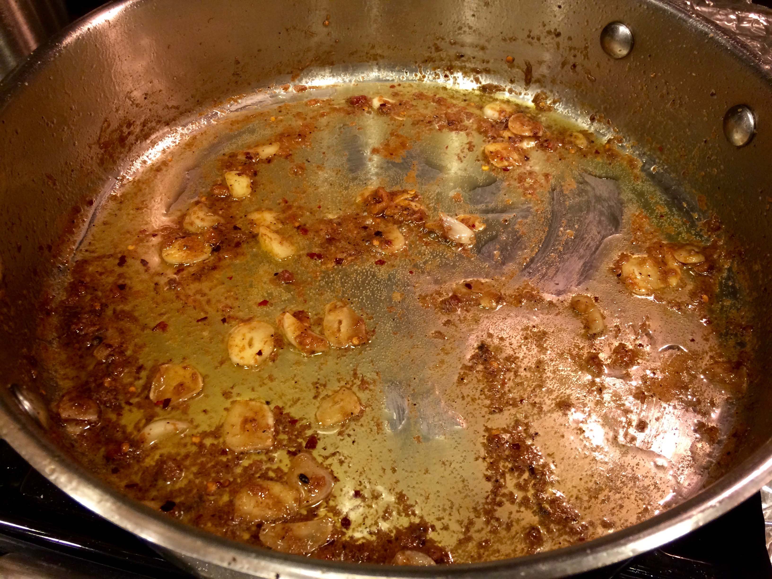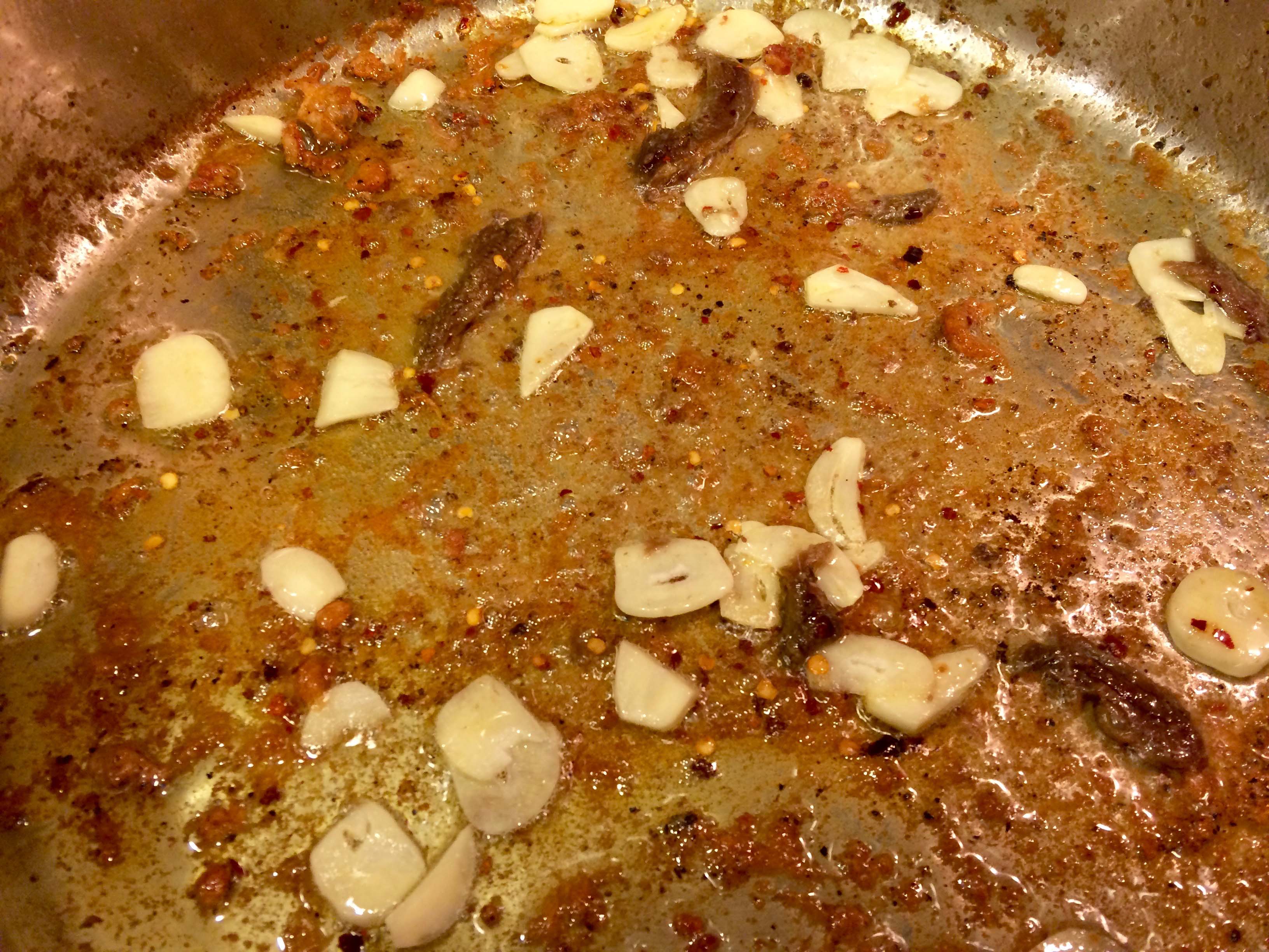 Add garlic, anchovy and red pepper flakes to skillet; fry 1 minute.