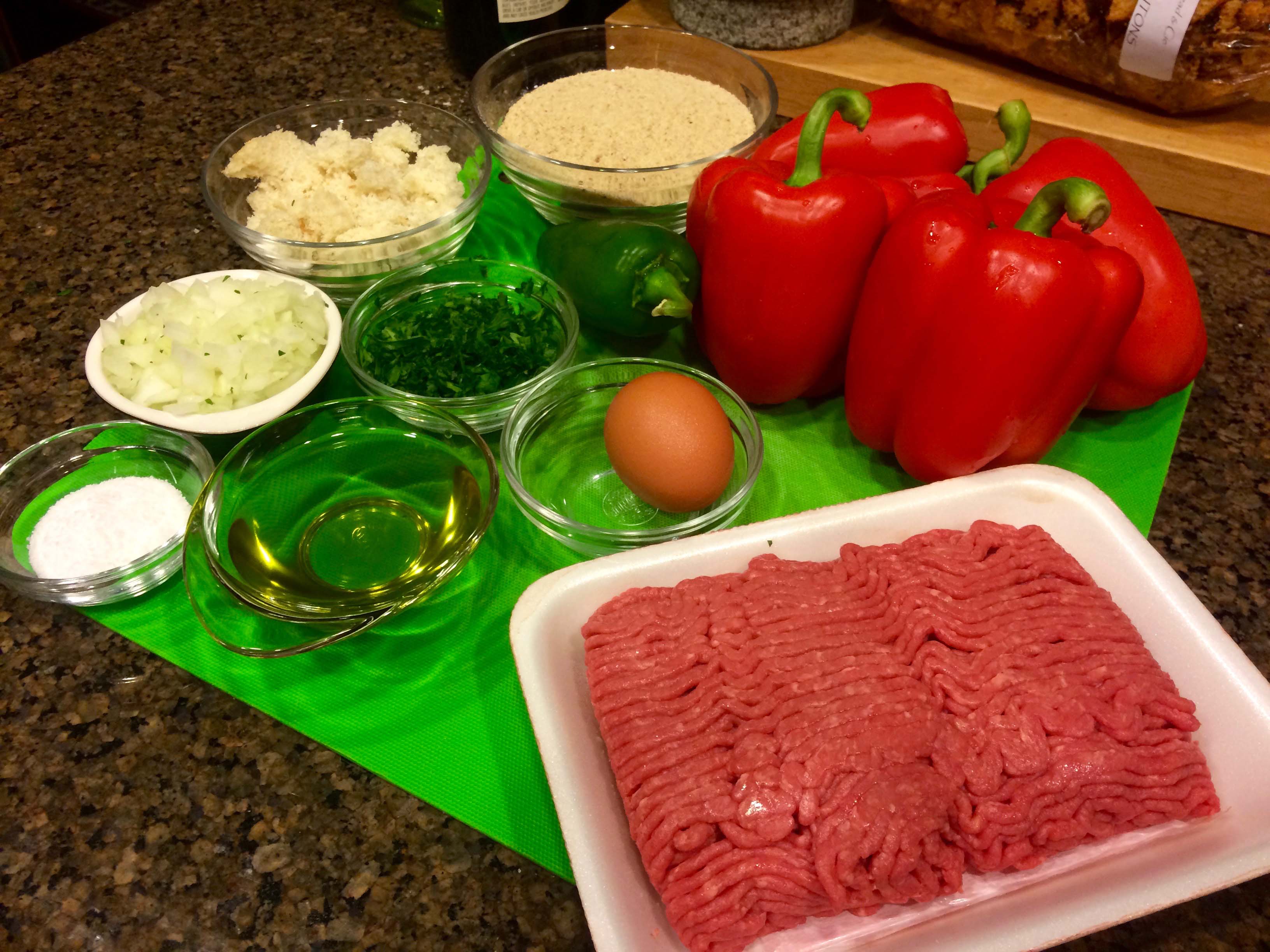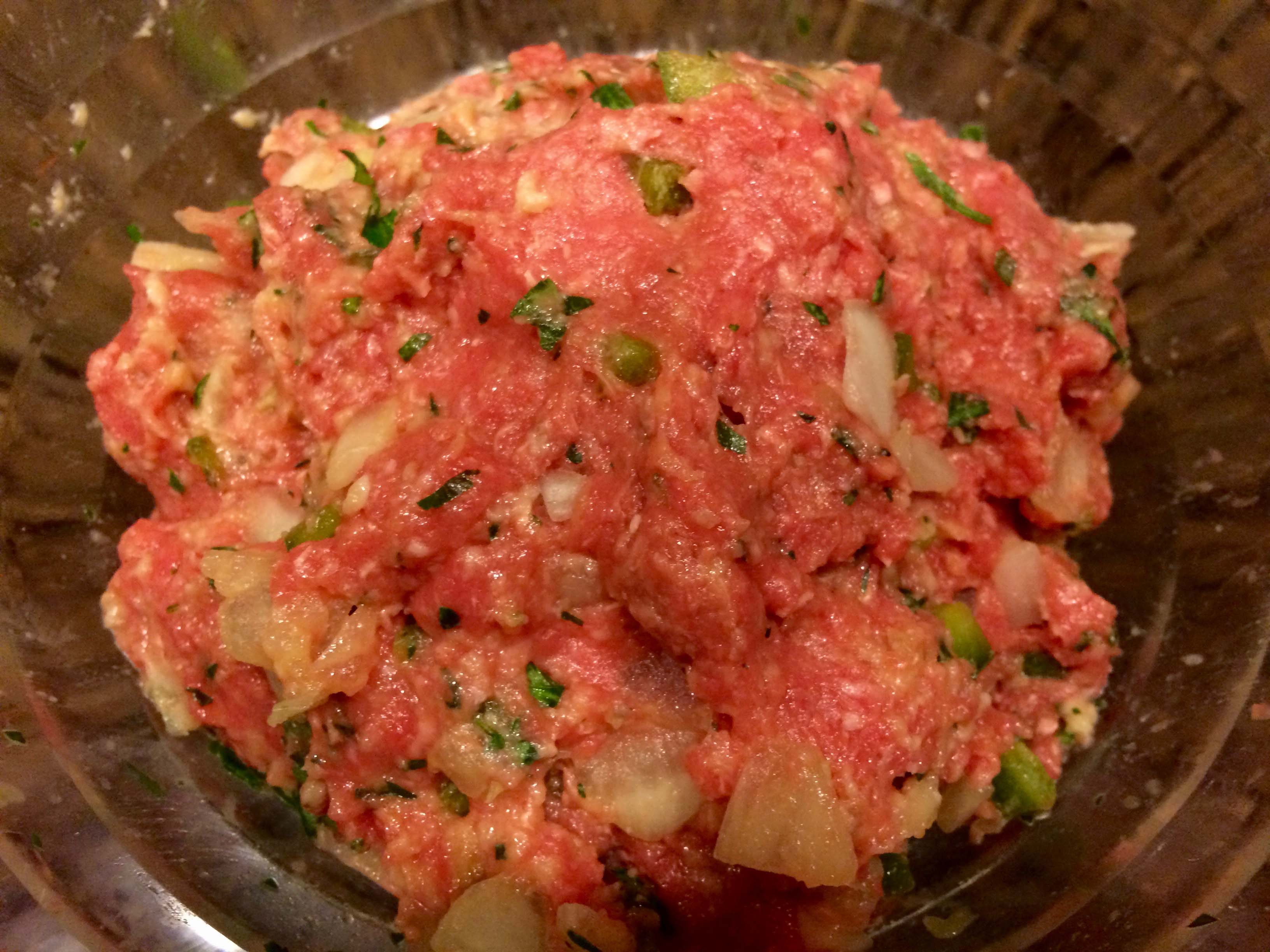 From that final collection, comes the recipe for today’s post, Polpettine di Manzo con i Peperoni, Spicy Beef Meatballs with Bell Peppers. These are nothing like the spicy meatballs one may associate with the legendary Alka Seltzer commercial or with the Italian-American versions that are part of many a Sunday sauce. Rather, they are small and delicate bundles of meat, gently mixed with parsley, chopped onion, and jalapeño pepper, and bound with egg and a white-bread panade, made from torn white bread soaked in milk.