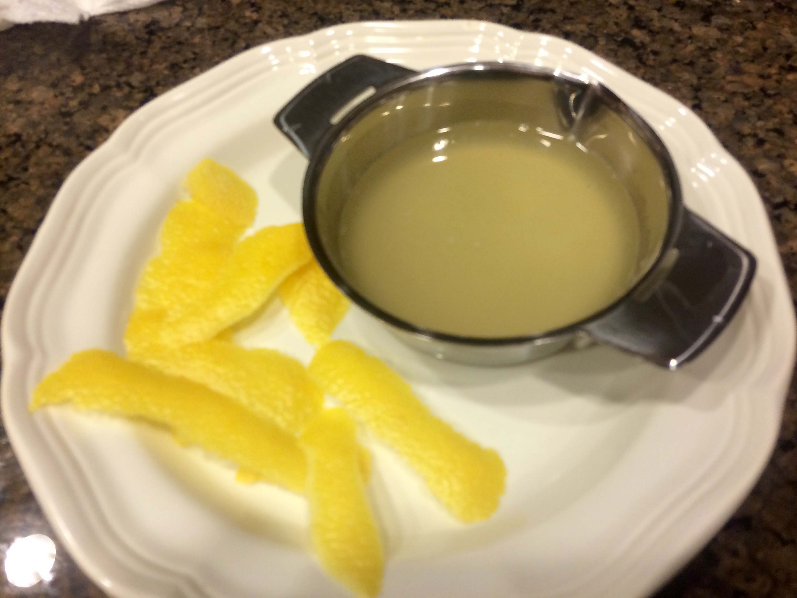 5-Tip the pan, and with a spoon remove all but 2 tablespoons of fat. Add the lemon juice and lemon peel, turn the heat on to medium low, and stir with a wooden spoon, scraping loose any cooking juices that have stuck to the pan.