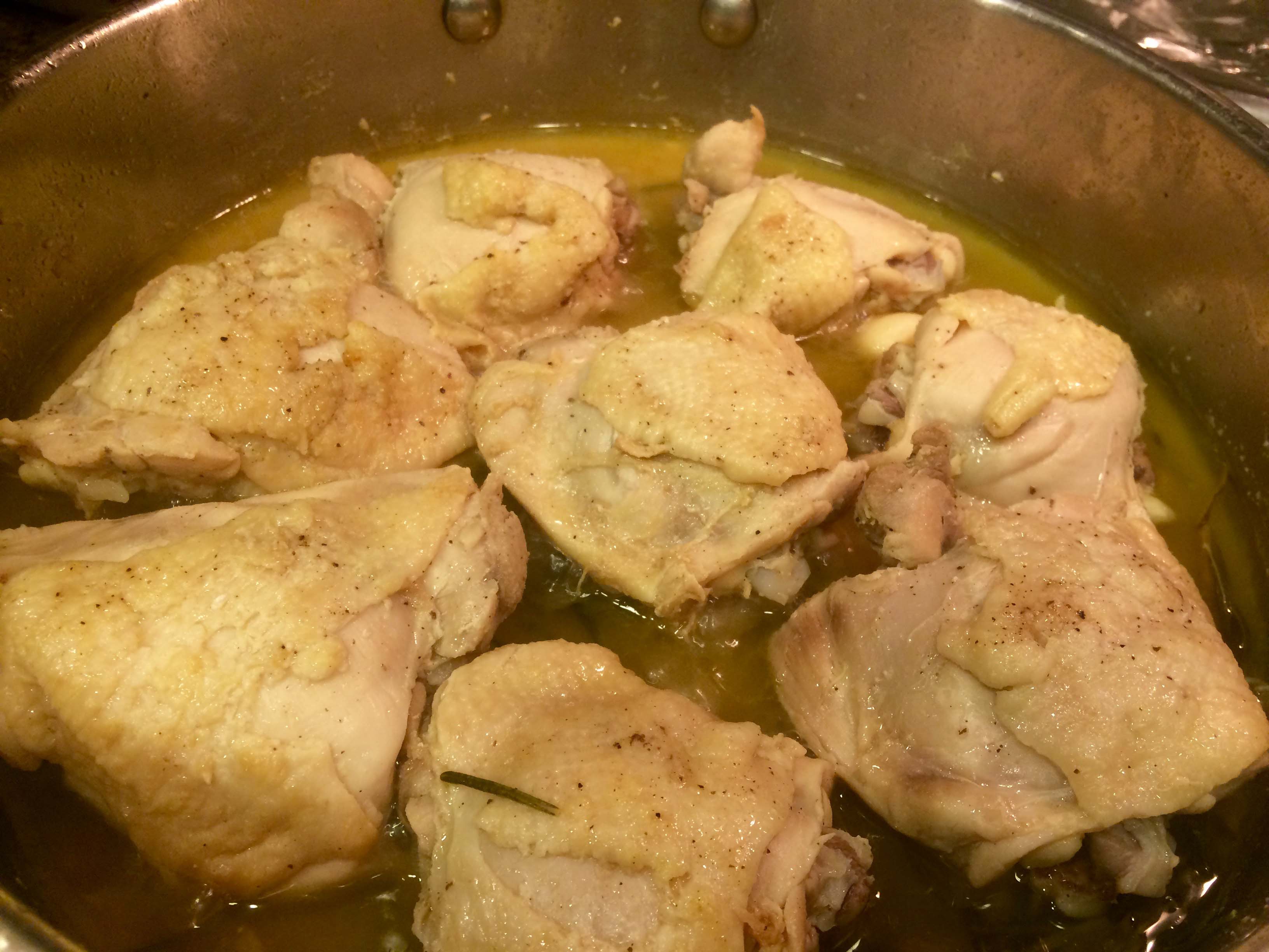 She does warn you to watch the chicken pieces and “turn them before they stick.” Yet even though I followed these directions and hovered over the pan like a mother hen, my chicken only attained just a tinge of brown. And maybe this is what was called for, since even if the chicken had browned normally, the skin would never have been crisp as the dish is cooked covered for 40 to 45 minutes. In fact, the recipe does specifically call for “lightly browning” the chicken.