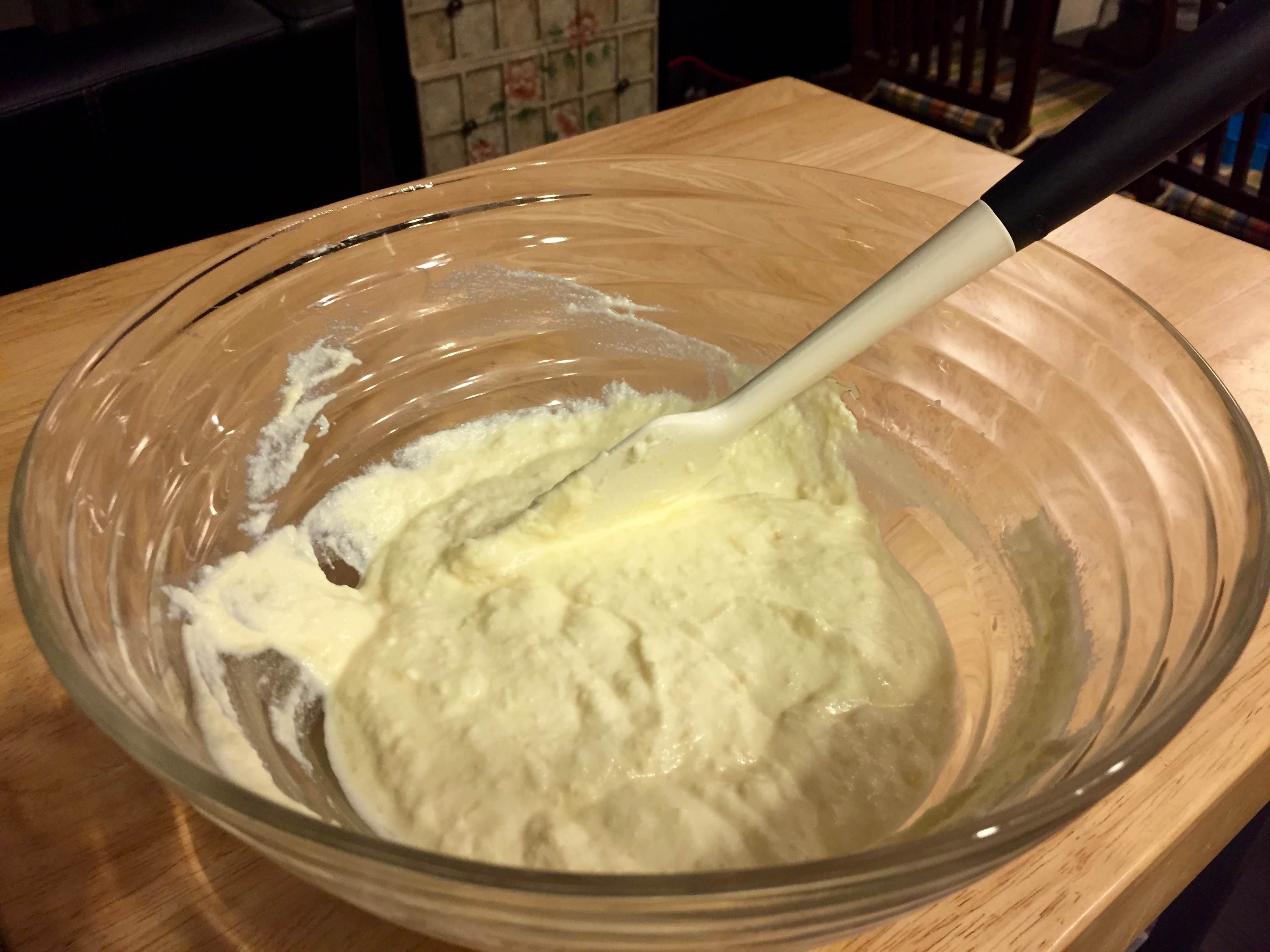 3. Add the all-purpose flour in 3 parts, stirring with a rubber spatula.