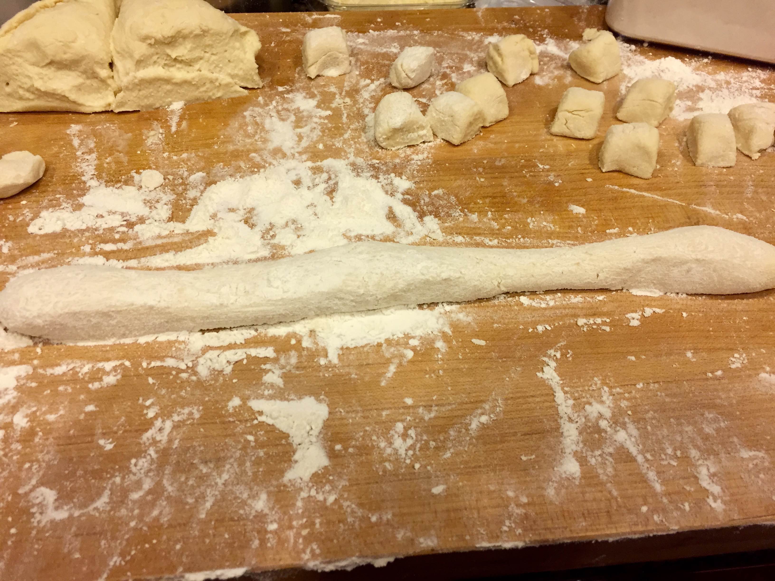 I believe that the photos in this post will show where I went wrong, especially the one of the finished ball of dough. Perhaps “sinkers”  is an apt description of the gnocchi.