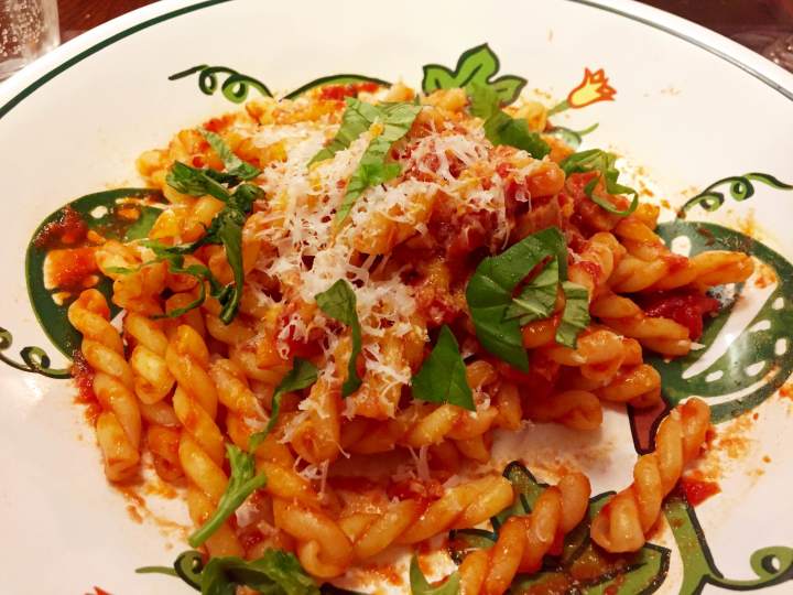 Fortunately, I used my own recipe for a pancetta-tomato sauce and had enough remaining to serve two helpings of perfectly al’ dente gemelli.