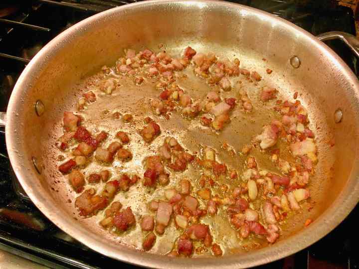 3.) With a slotted spoon, remove the pancetta from the pan. Drain all but 2 tablespoons of the remaining fat from the pan.