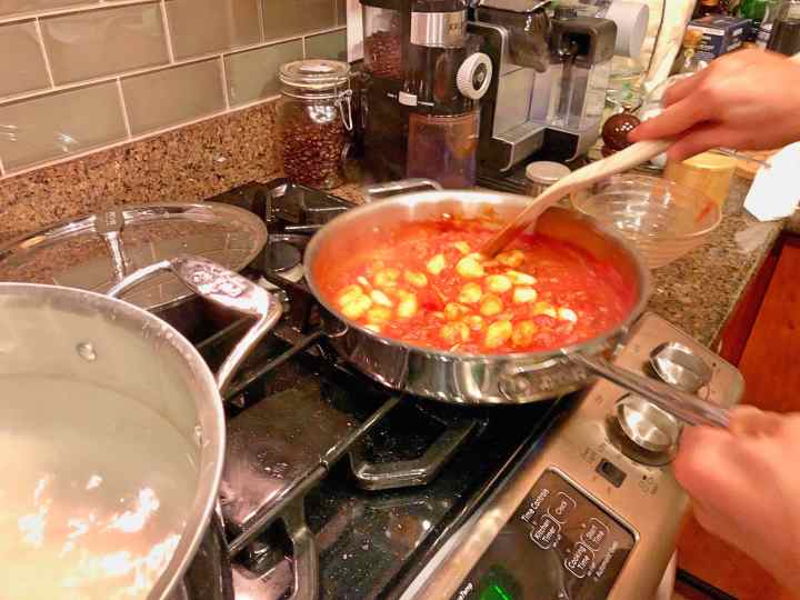 10.) Over the lowest heat, gently stir the gnocchi for a minute or two to coat them with the sauce.