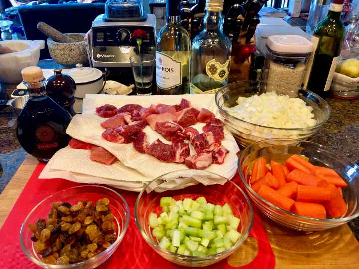As we’re officially into winter now and even here in sunny San Diego it’s turned a tad chilly, I was in the mood for a winter stew. Having some cubed pork shoulder in my freezer contributed to my looking for a pork stew recipe. After looking through my cookbooks, I settled on a relatively simple recipe from Michele Scicolone’s The Italian Slow Cooker for a Pork Stew Agrodolce.