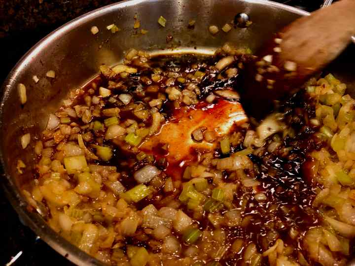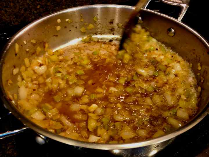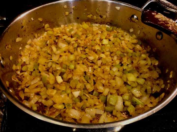 3. When all the meat has been browned, reduce the heat to medium. Add the onions and celery to the skillet and cook, stirring frequently, until golden. (Take your time with this step to extract the sweetness from the onion. RM)
