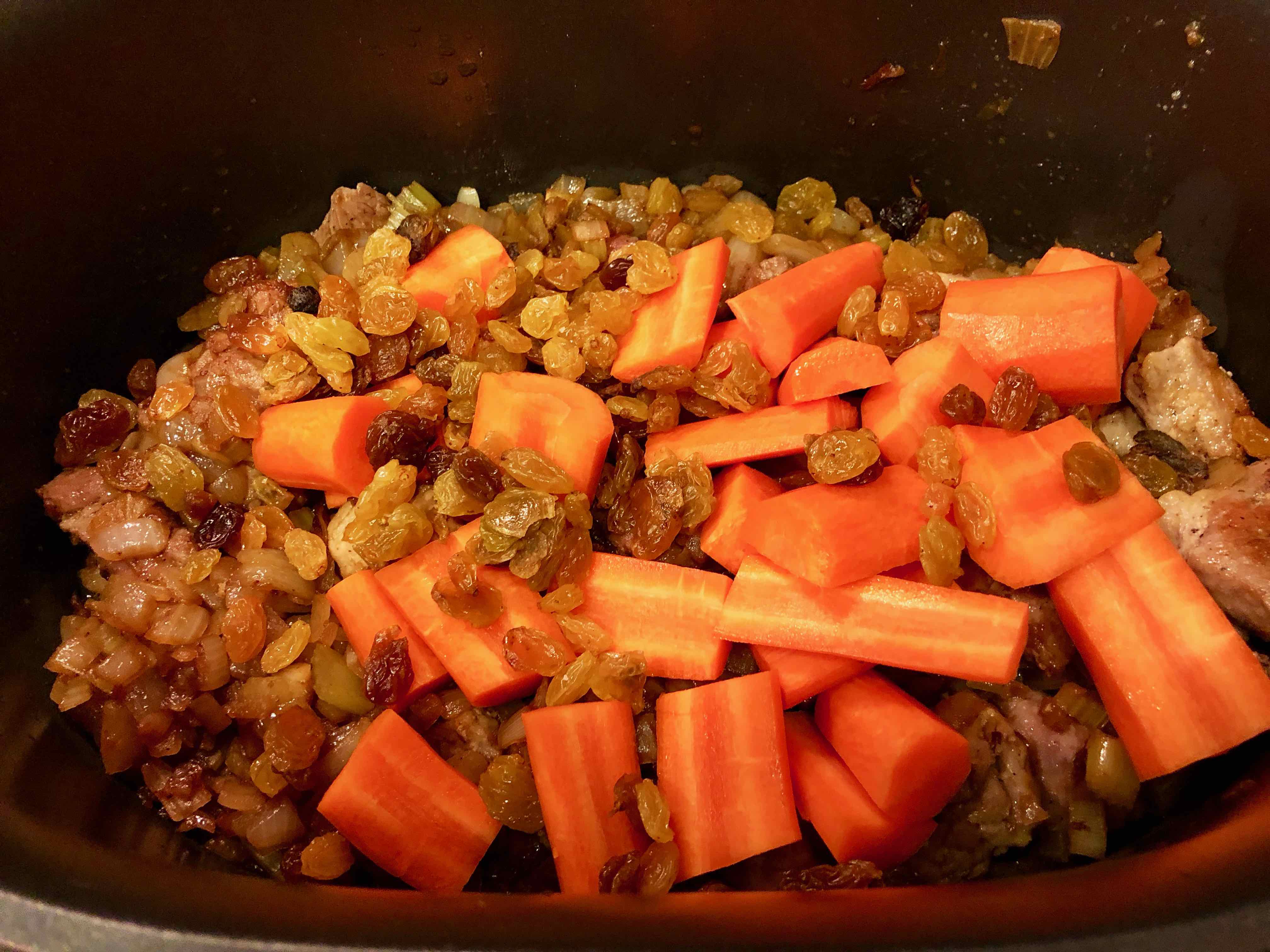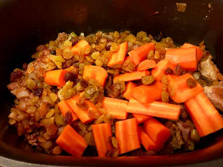 5. Transfer the onion mixture to the slow cooker. Add the carrots and raisins.