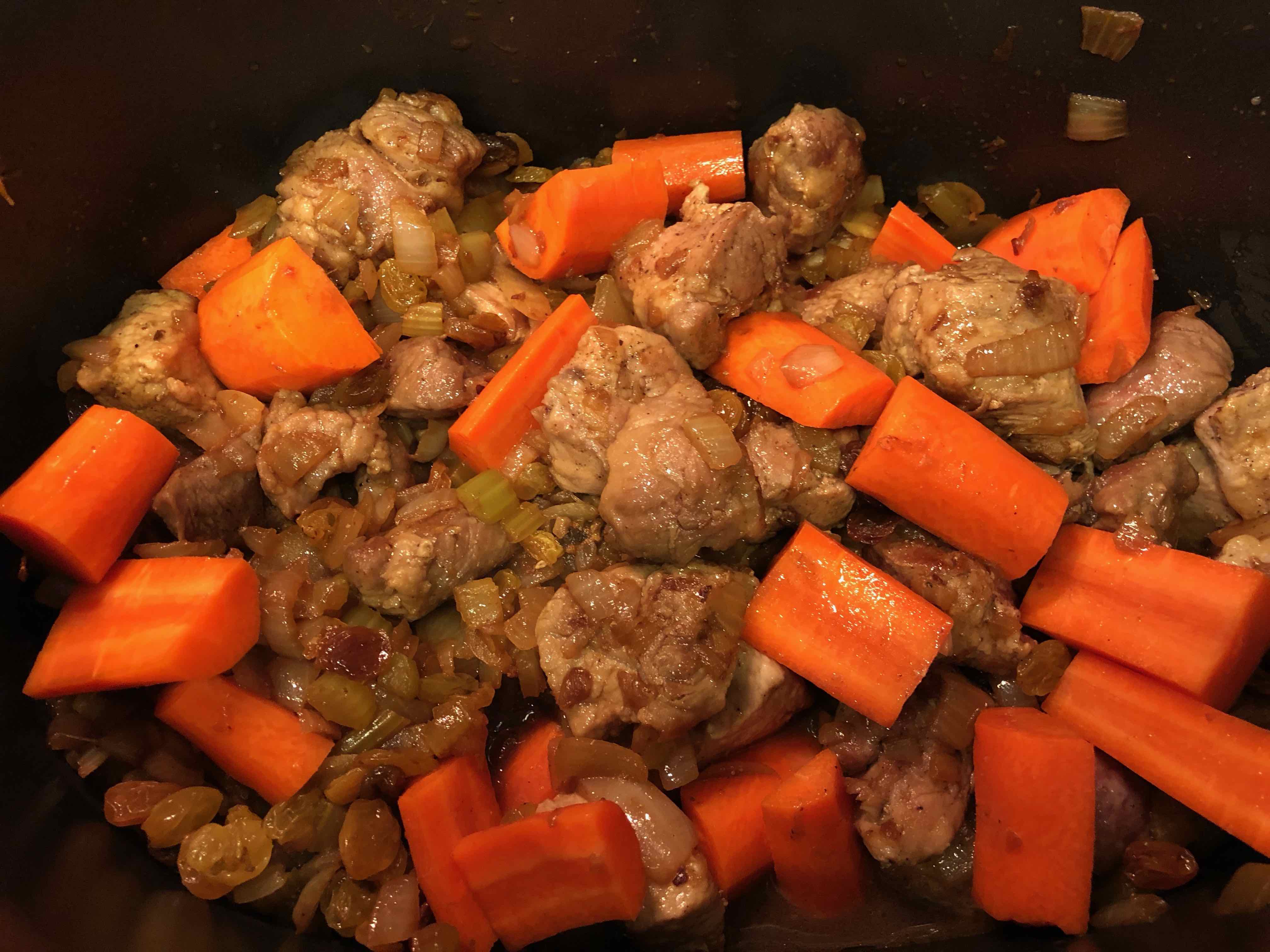 Scicolone has a well earned reputation for no-fail recipes and having written several books for slow cookers has made her an authority on this popular cooking appliance. What intrigued me especially about the recipe was that it didn’t call for any seasoning other than salt and pepper and didn’t call for any herbs. The stew’s contrasting bitter-sweet flavors evolve from the sweetness of onions, golden raisins, and carrots foiled by the acidity of wine and balsamic vinegar. Succulent tender cubes of pork provide the perfect canvass for the gravy.