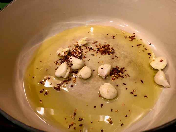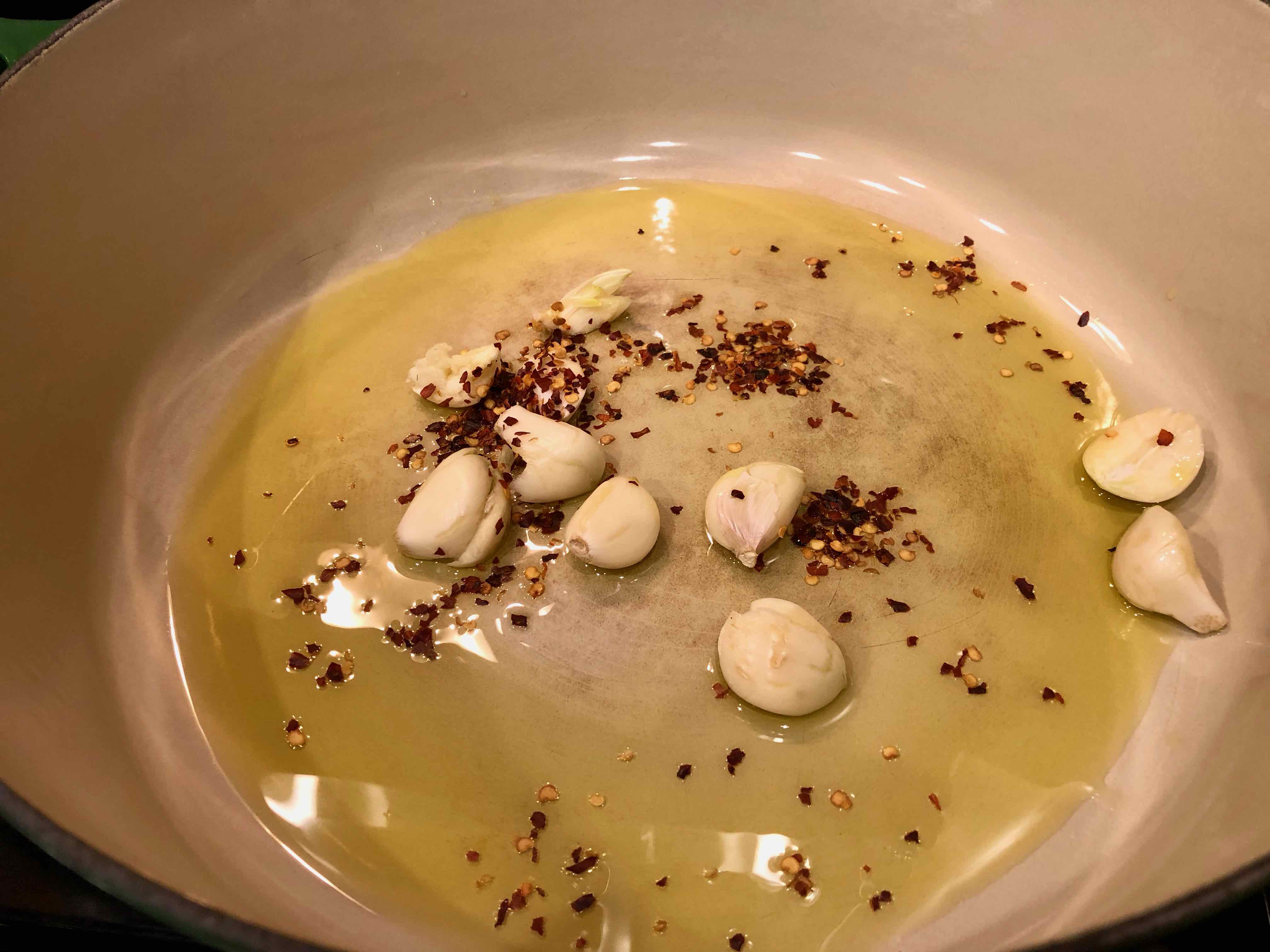Pour the olive oil into the pan, and set it over medium heat. Scatter in the crushed garlic cloves and peperoncino.