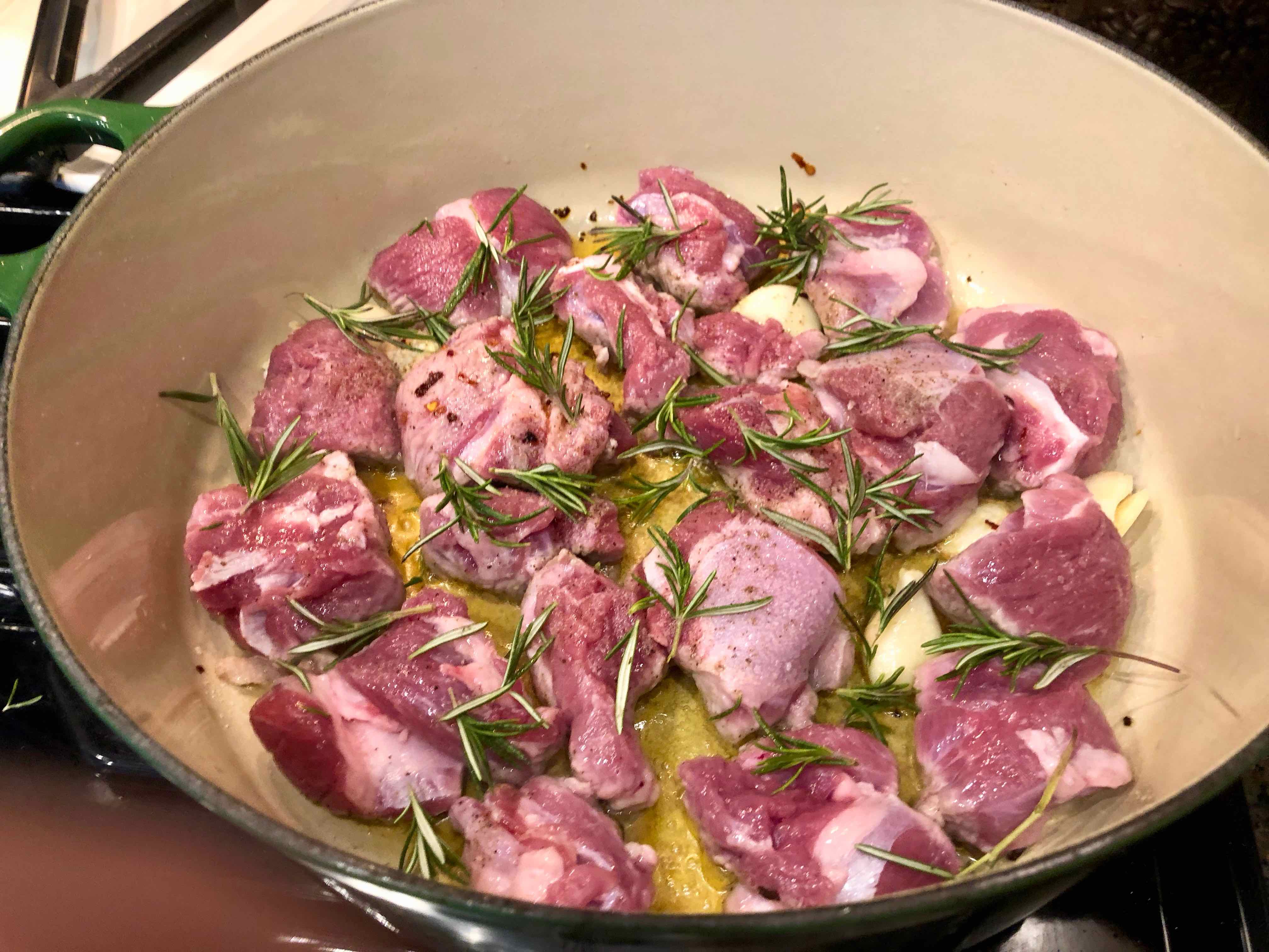 When the garlic is sizzling, lay in all the lamb pieces in one layer, scatter the rosemary on top, and season with the remaining teaspoon salt.