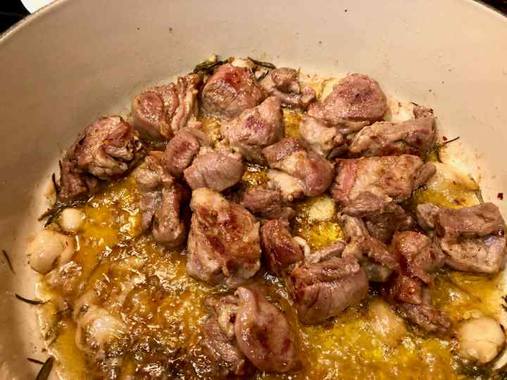 “Everything would be fine,” I told myself. I started the dish two hours before our guest was expected. But then I ran into what looked like a major problem: my lamb wasn’t browning. Unlike most recipes, Lidia’s called for slowly browning the meat covered. After the first 10 minutes, my lamb was at best grey and some chunks were even pink. Perhaps I had lowered the flame too much. I raised the heat and, after the next 10 minutes, the meat was only slightly more browned. “Be patient,” I thought; “It will brown eventually.” Once again, I raised the heat almost to the original “medium” setting. After another 15 minutes, the meat was close to being thoroughly browned and required only a few more minutes uncovered to reach the required “nicely browned all over” state.