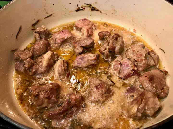 Turn again in 10 minutes or so, and continue covered cooking for another 10 to 15 minutes, until the lamb is nicely browned all over and the pan juices have thickened and caramelized.