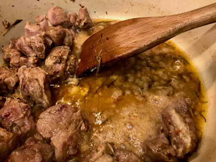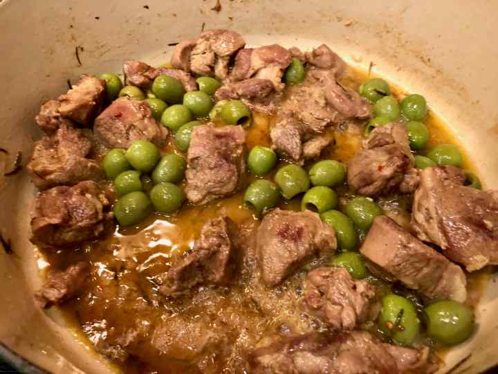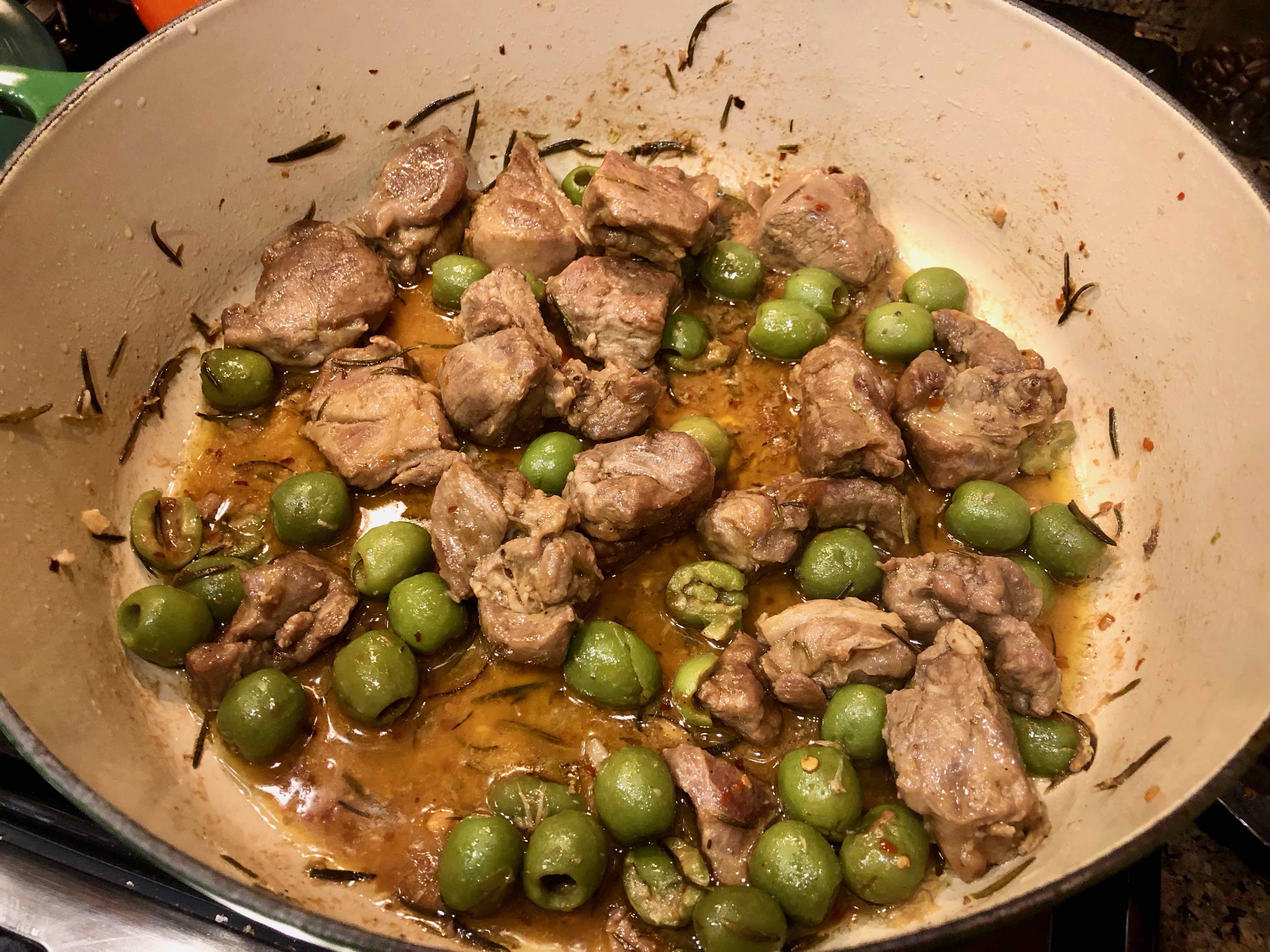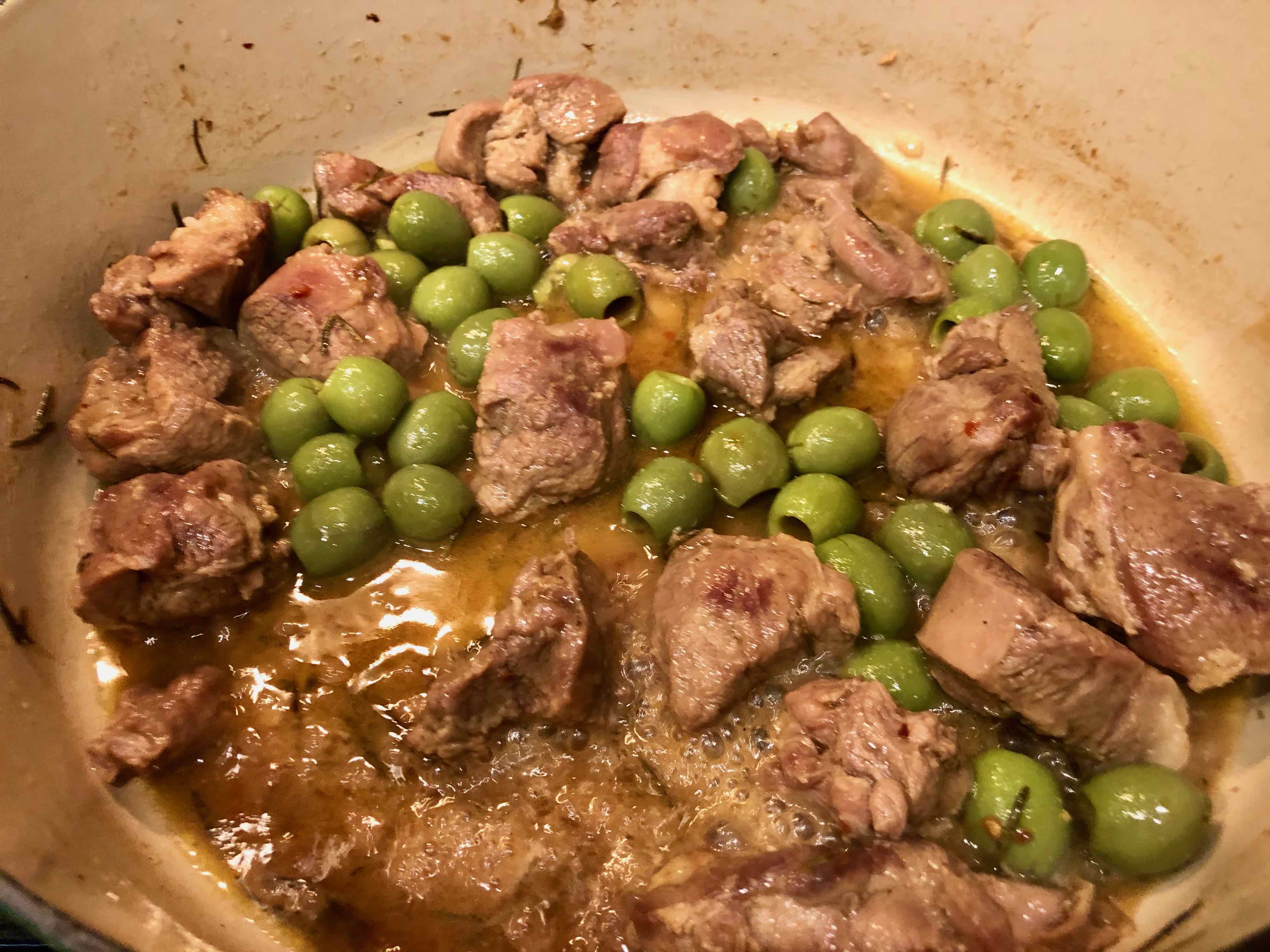 Drop the olives into the pan, all around the lamb chunks, then cover and adjust the heat to a bubbling simmer. Cook for another 10 minutes or so, again concentrating the juices and marrying the flavors.