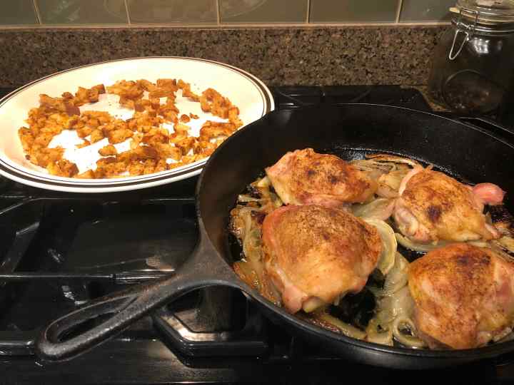 Over the past couple of weeks, I’ve prepared three versions of this dish and thought that I would share them with you today. All three are centered on bone-in, skin-on chicken thighs that have been well trimmed of excess fat and skin in order to reduce the amount of residual fat. What I especially like about thighs is that they’re virtually impossible to overcook and are more flavorful than white meat.