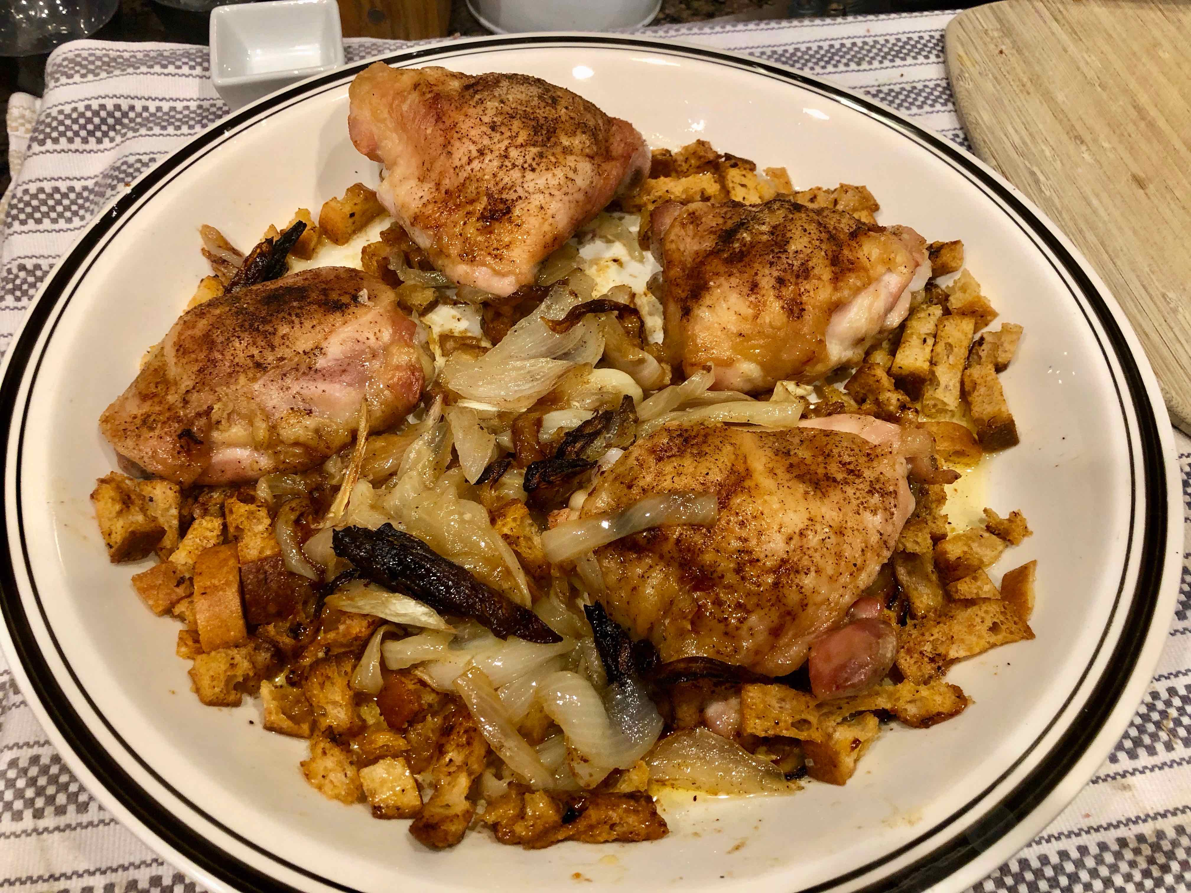 Chicken with Caramelized Onions and Croutons (adapted from Sam Sifton’s “You Don’t Need a Recipe”)