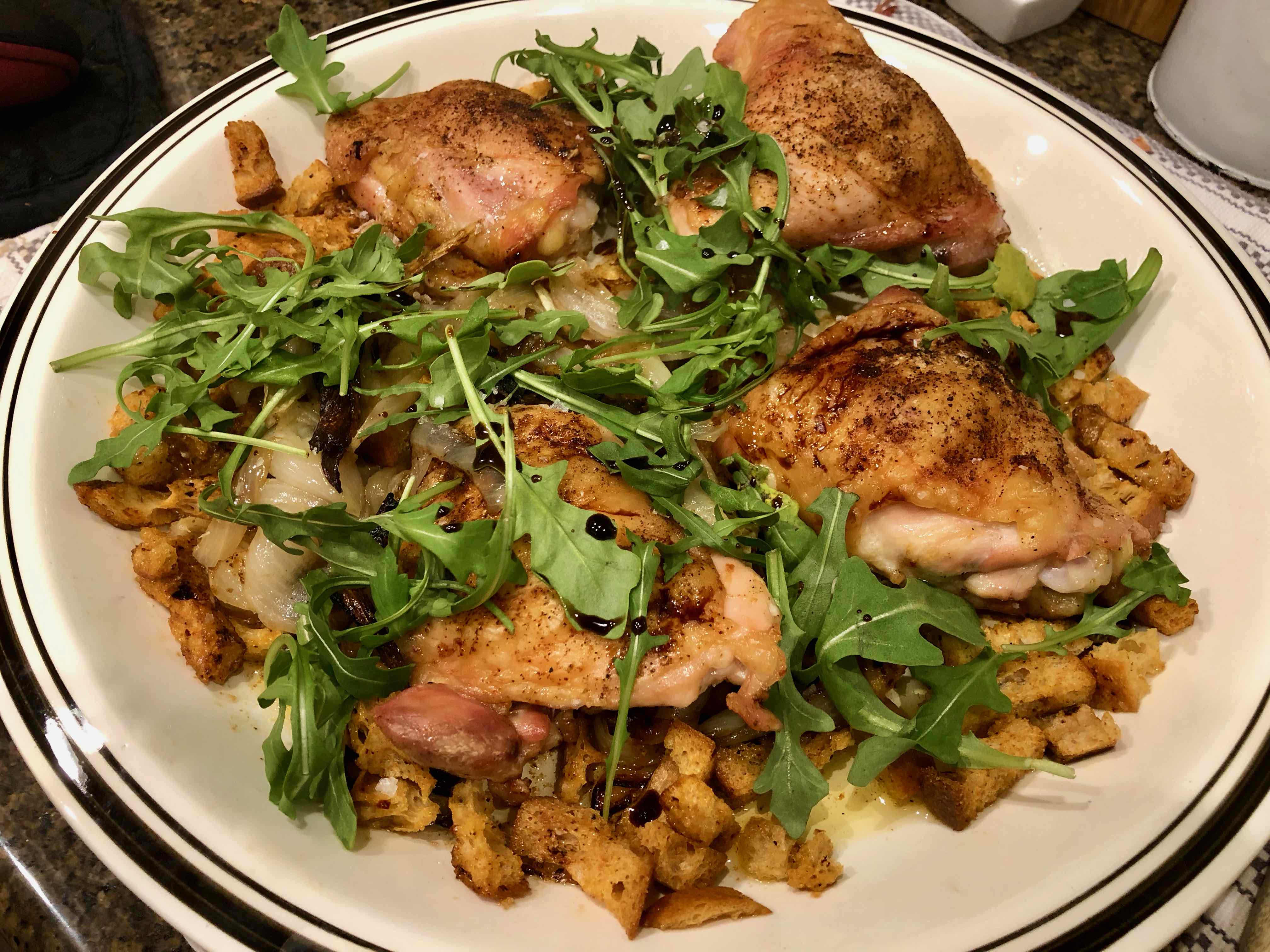 4) Meanwhile, make some croutons from good, chewy olive-oil-tossed bread, toasting them until golden in a pan or in the oven alongside the chicken. They can be cut or torn up — no matter. Put the croutons on a warm platter, dump the contents of the roasting pan over the top and arrange the chicken on top of that, mixed with bitter greens. (I use croutons from a local bakery that are perfectly seasoned and toasted, which makes this dish even easier. For the bitter greens, I opted for arugula. I also drizzled some rich balsamic over the dish.)