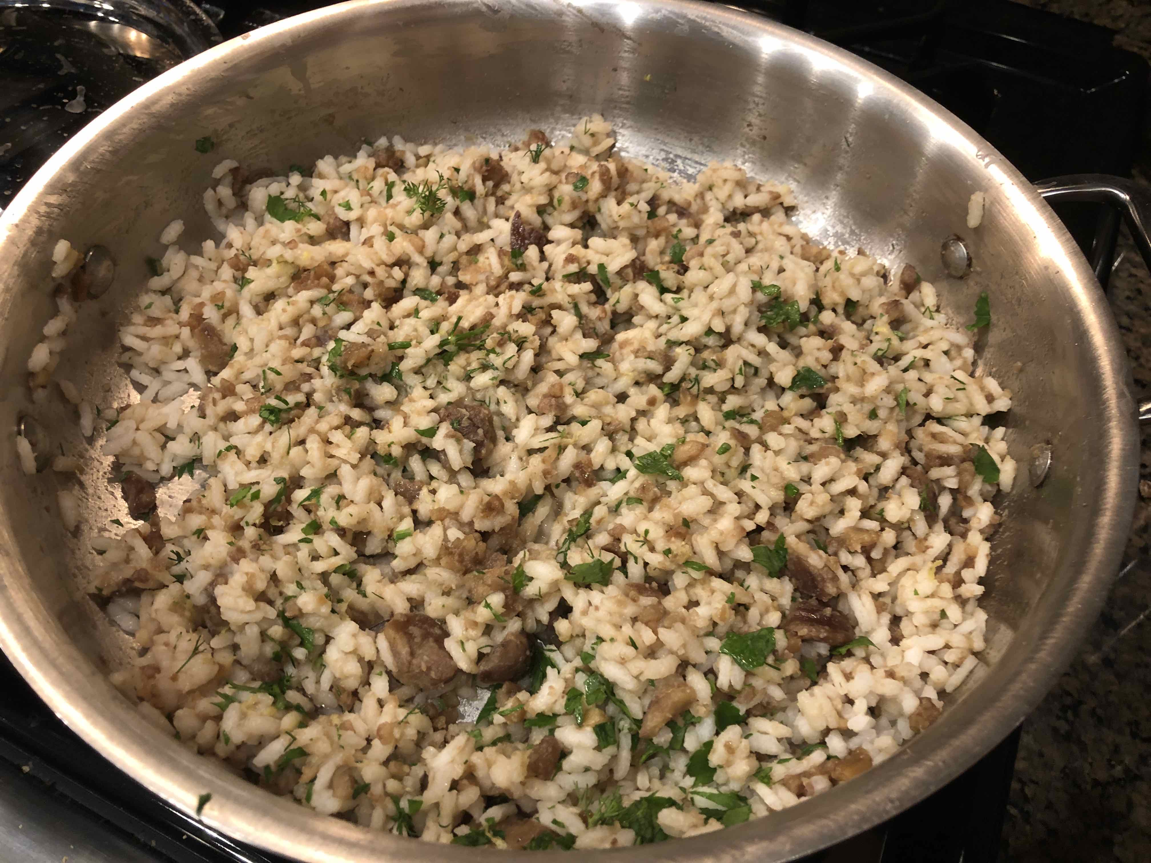 7. Add the drained rice to the chestnuts. With a fork, mix to combine, adding the chopped dill, parsley, and lemon zest. If too dry, add some of the cooking water to loosen.