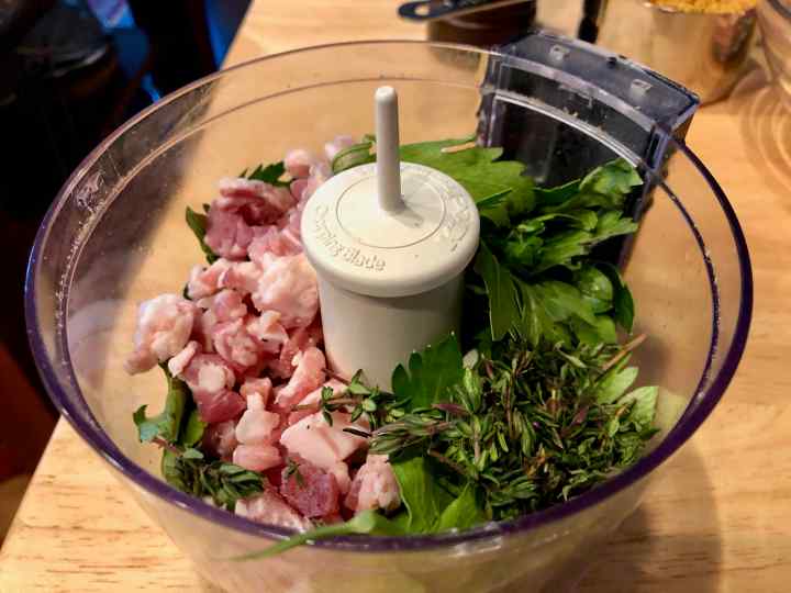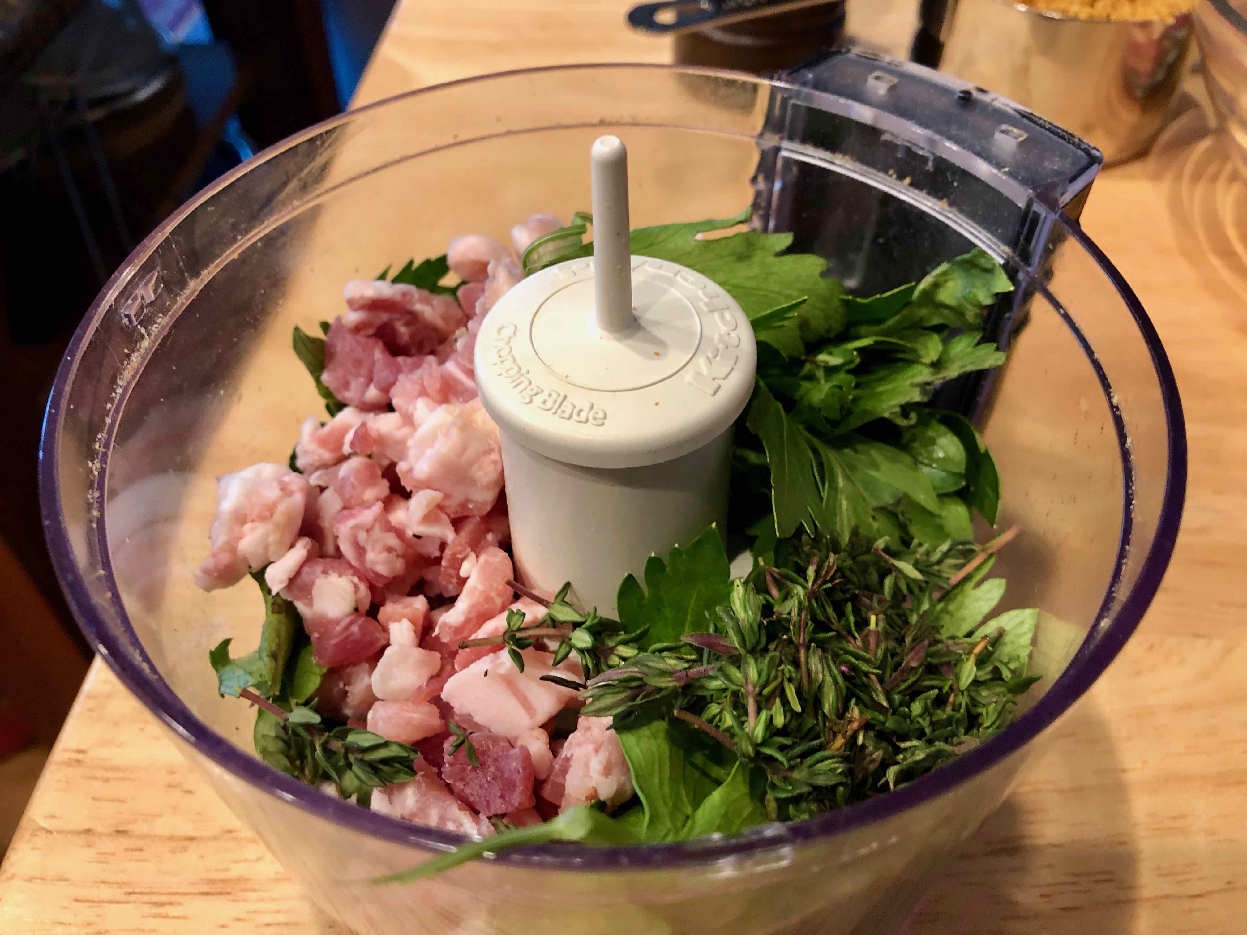 1- In a food processor, or by any other method, chop the pancetta or bacon together with the celery leaves and bay leaves. Chop to a very fine consistency, making sure no long, sharp bits of bay leaf remain. (I substituted fresh thyme leaves.)