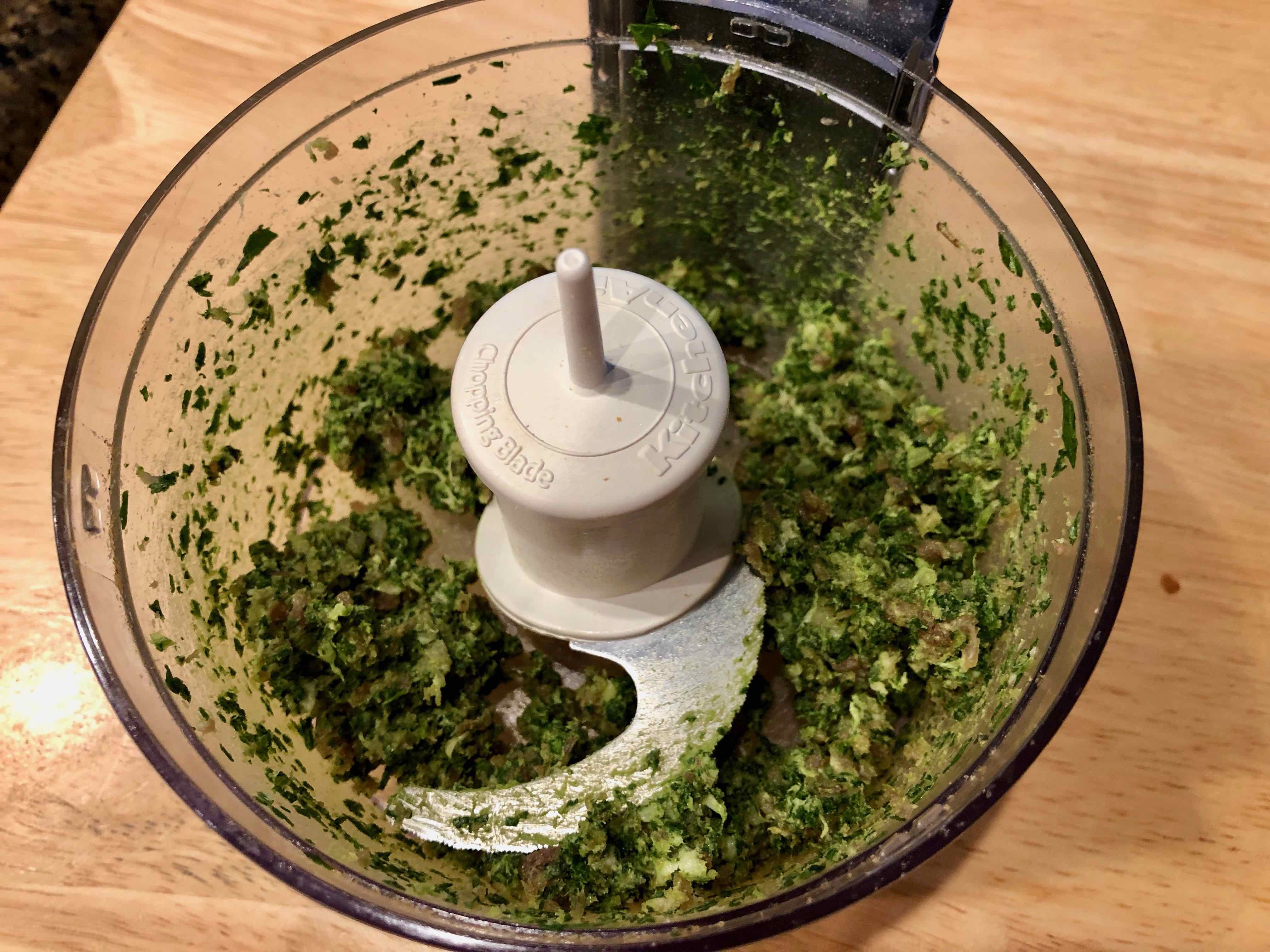 Key to both flavor and texture are the celery leaves. The recipe calls for a half cup of leaves “from the tops of a celery heart”; however, these days most celery seems to come with just a few. For this reason, I visited our local farmers market, where I was able to find a bunch of celery sporting a full head of huge, verdant leaves.
