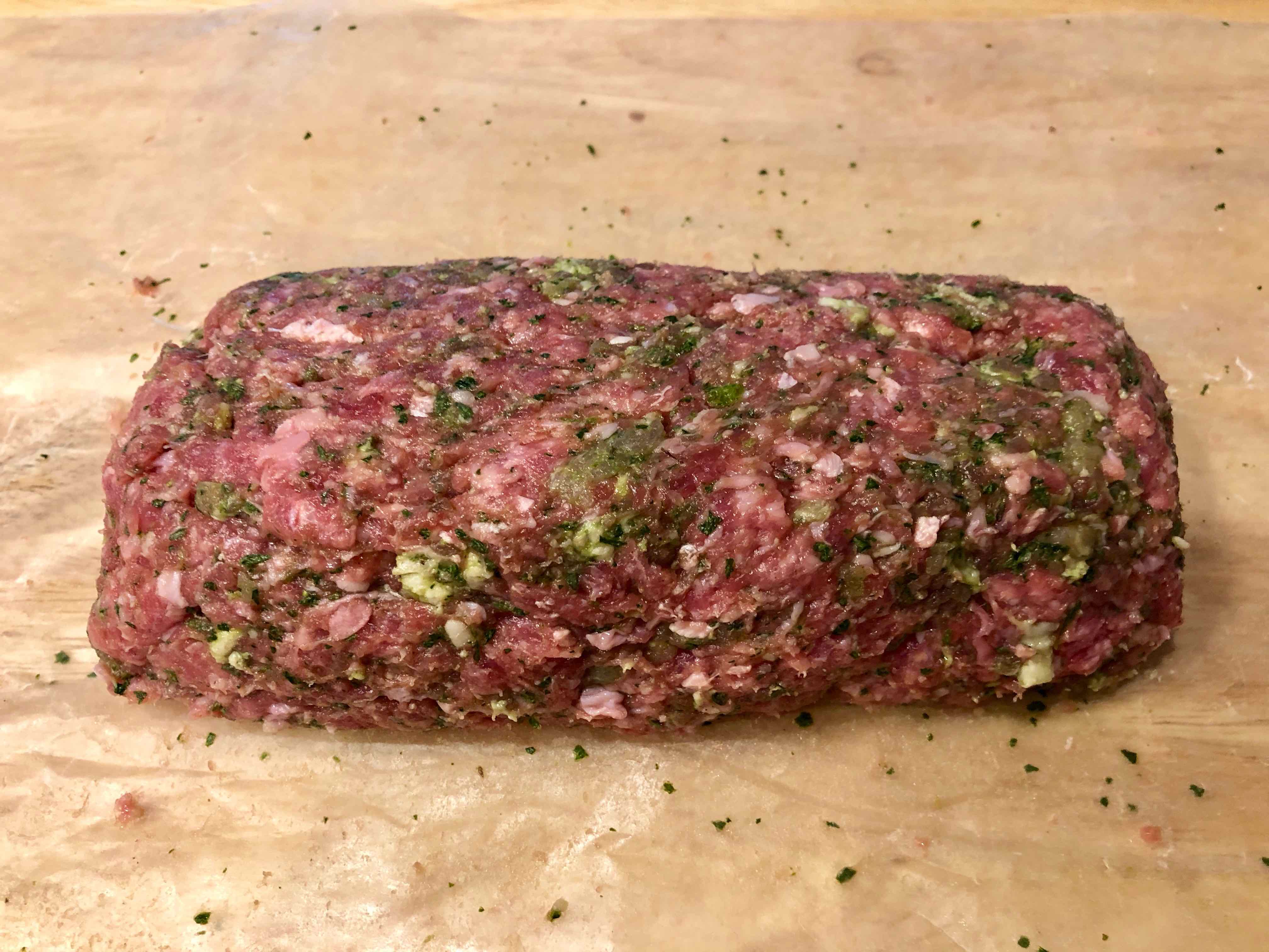 3- Knead the meat with your hands to amalgamate all the ingredients thoroughly. Shape the meat into a roll about 6 to 7 inches long and 4 inches thick.